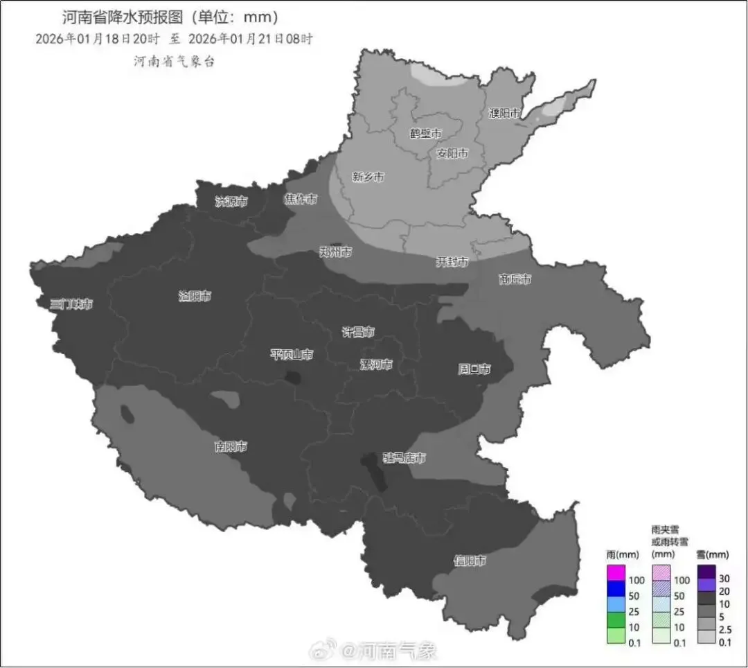 本周日(1月18日)夜里,整个河南省都将迎来2026年的第一场雪,下周一(1月19日)由雨夹雪转为暴雪!气温从零上17°一路下滑跌破零下10°! 图片来源——微博@河南气象