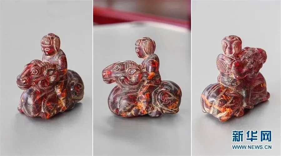 ▲出土的琥珀小儿骑羊串饰,现藏洛阳博物馆。图源:新华网。