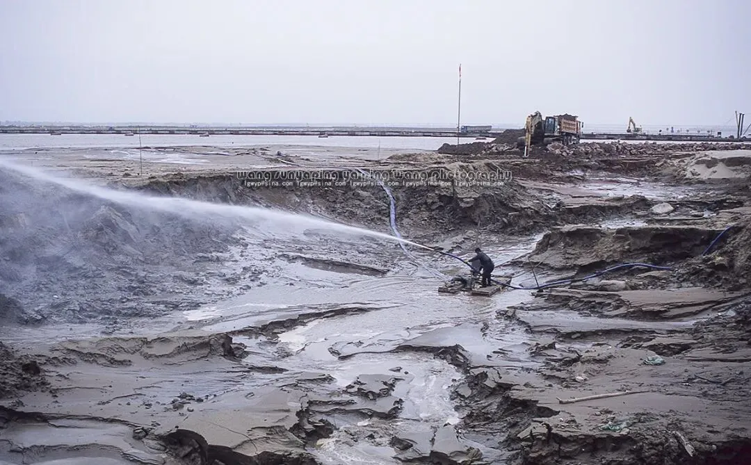 2016年4月2日,河南省郑州市惠济区花园口镇南月堤。花园口黄河浮桥。黄河右岸,工人们正在用高压水枪挖基础,准备修建护桥坝。