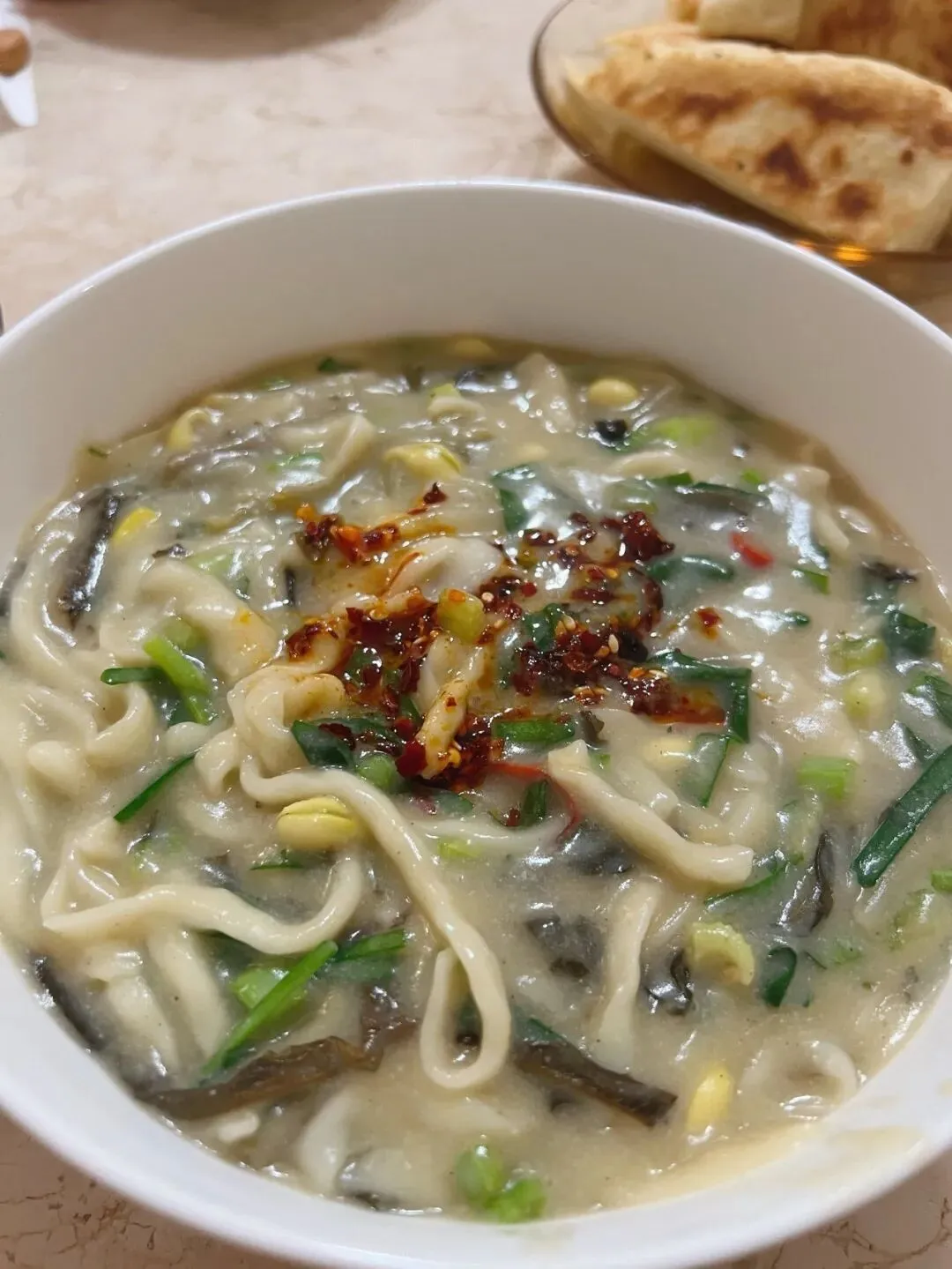 把两张晶莹翠绿的“不翻”叠着放在碗里,舀些滚烫的猪骨头汤浇在上面,再放上些粉条、黄花、木耳等,还要舍得放些醋、胡椒粉,于是一碗不翻汤就做好了。这个汤吃到嘴里时,“不翻”软绵不化,嚼之有 豆香;汤酸辣清淡,余味悠长,是洛阳本地人吃夜宵的首选。