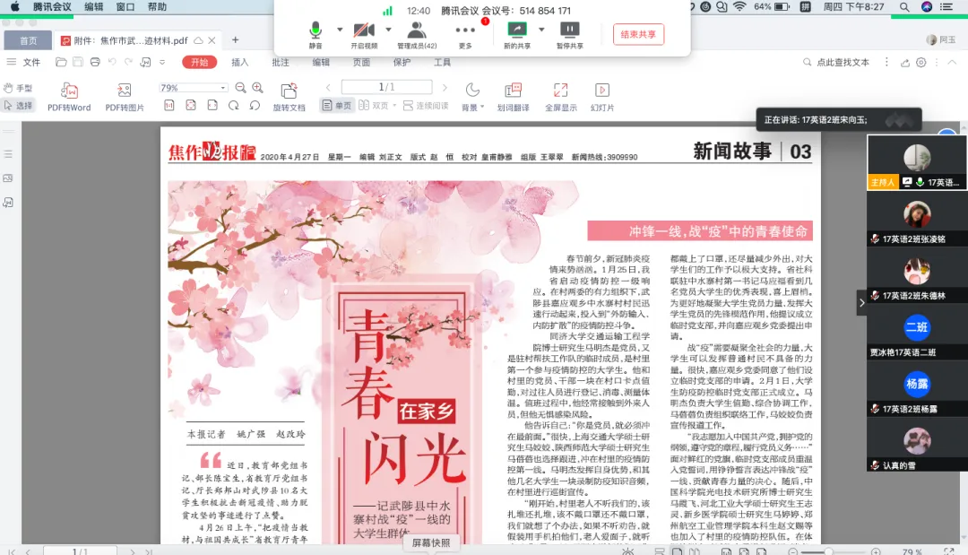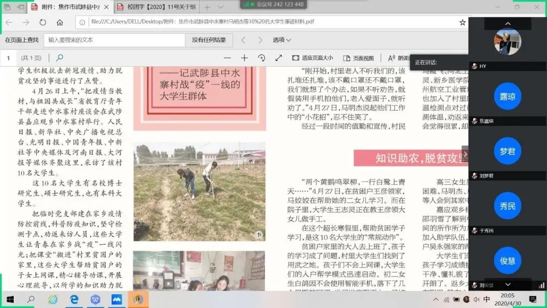 本次团课围绕焦作市武陟县中水寨村马明杰等10名大学生优秀群体在疫情防控中的先进事迹进行学习。在疫情期间,他们积极响应习近平总书记和党中央号召,利用寒假返乡之际,主动报名、投身所在乡村的疫情防控和脱贫攻坚工作,以自己所学知识和实际行动回报家乡父老。在疫情形势稍有缓解之后,他们主动帮助企业和群众复工复产,协助村民春耕备耕,灌溉农田,栽种果树,尽己所能促进本村经济社会发展。他们走访慰问村里贫困户,发挥自身专业优势为贫困户家庭的中小学生辅导功课,还通过直播方式进行网络授课,受到学生们的欢迎,得到了村民的充分肯定和高度赞扬。他们崇高的家国情怀和无私奉献的担当精神值得我们每一个青年人学习!