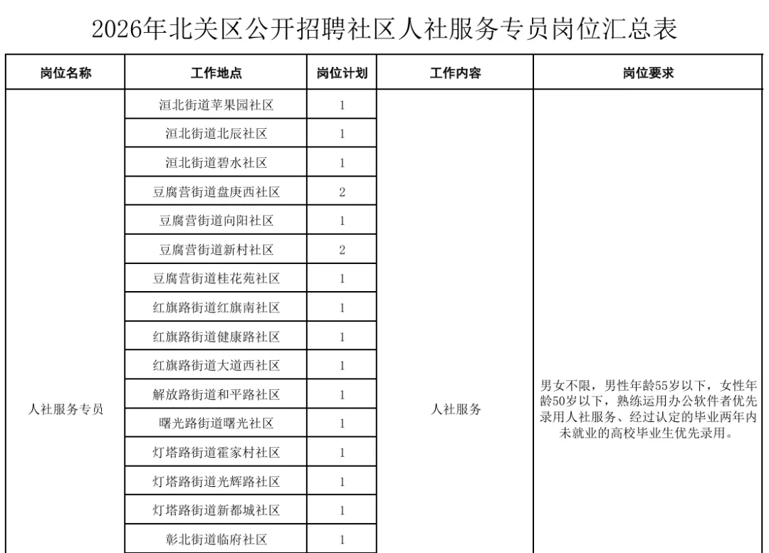 附《2026年北关区公开招聘社区人社服务专员岗位汇总表》