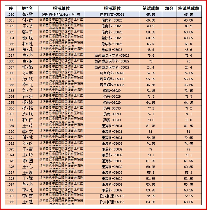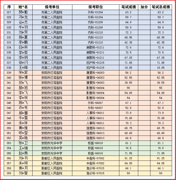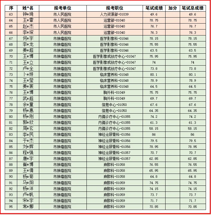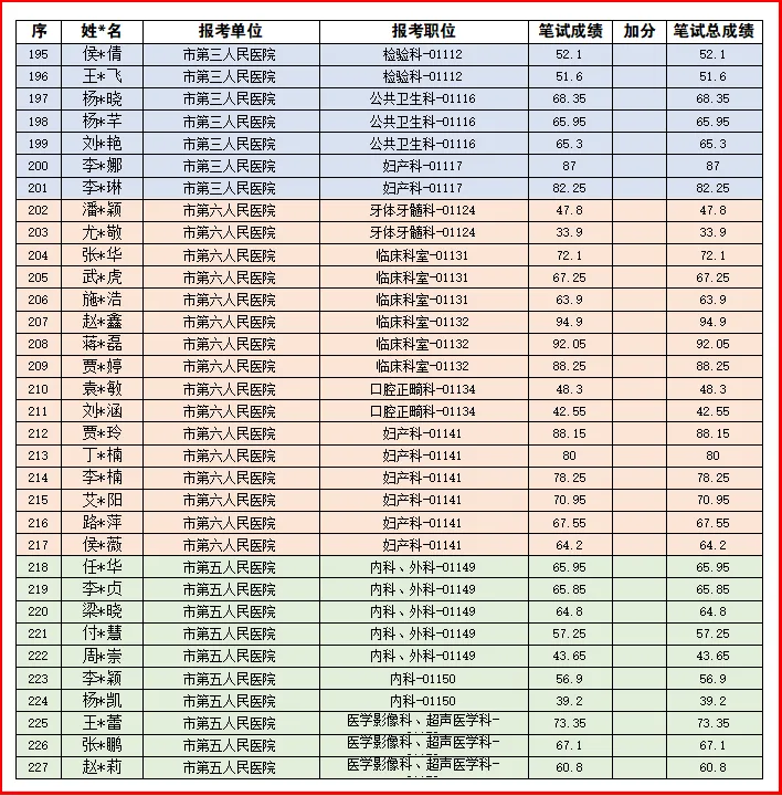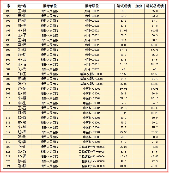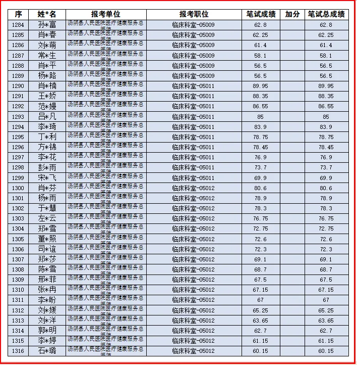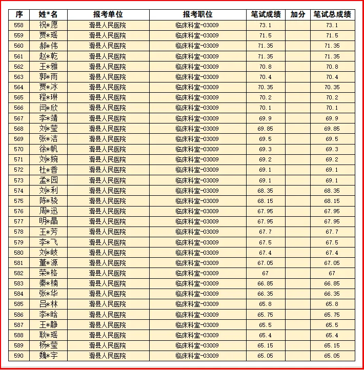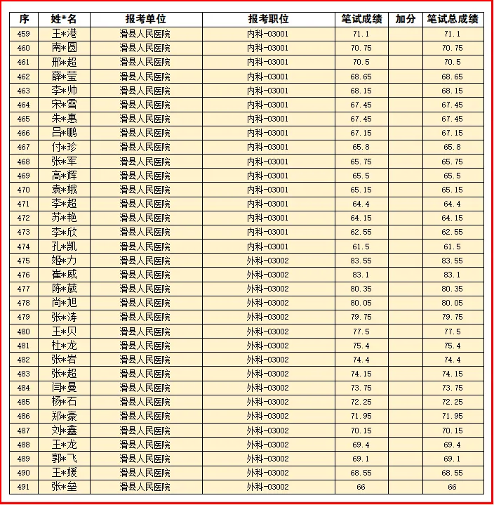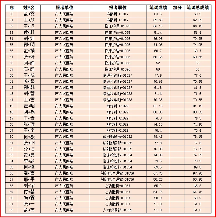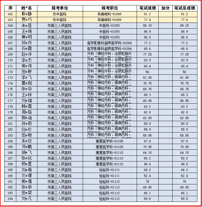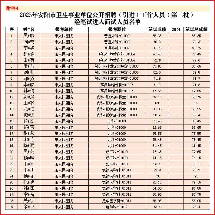 按照《2025年安阳市卫生事业单位公开招聘(引进)工作人员(第二批)简章》(以下简称《简章》)的有关规定,结合考生报名及笔试情况,经研究并报市人社局同意,决定在2025年安阳市卫生事业单位公开招聘(引进)工作人员(第二批)中核销不具备开考条件的市人民医院岗位代码01003等29个招聘岗位(详见附件1);对市人民医院岗位代码01005等79个急需短缺专业岗位(见附件2),保留原计划招聘人数,在确保竞争的前提下,降低开考比例进行面试;对市人民医院岗位代码01004等22个急需短缺专业岗位(见附件3),核减招聘人数后,在确保竞争的前提下,降低开考比例进行面试。根据报名、笔试及核销招聘岗位、核减招聘人数情况,拟确定报考市人民医院的吴腾啸等1531名考生进入面试(详见附件4、5)。
