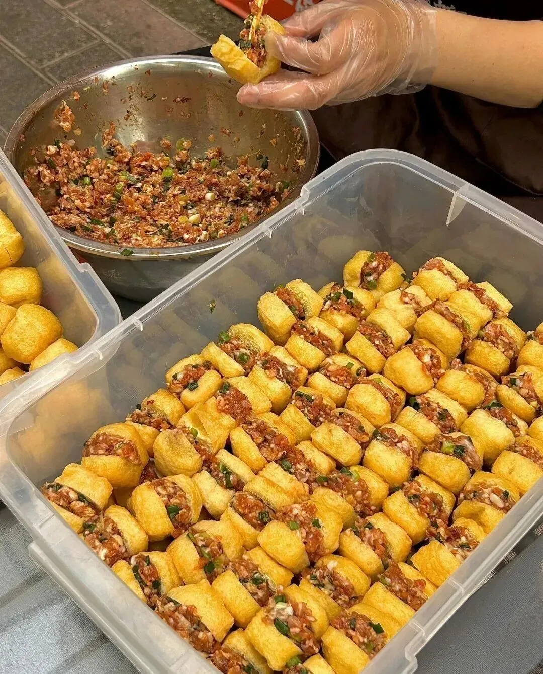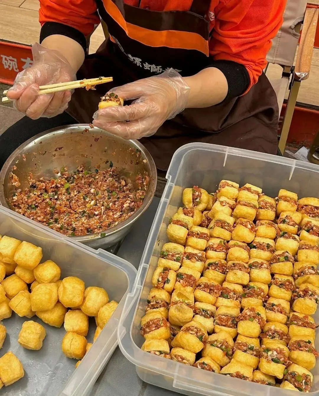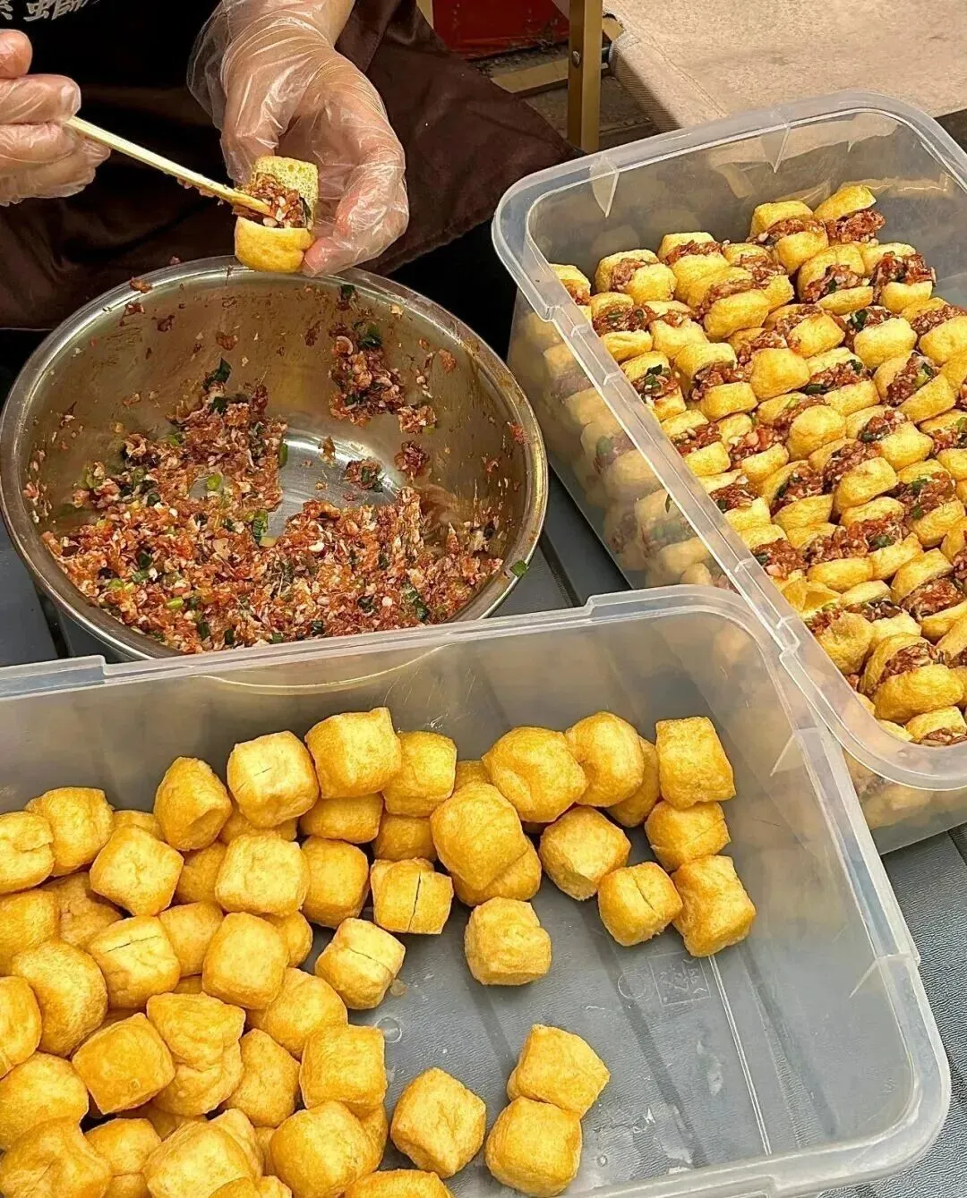 一个阿姨在那儿现包豆腐酿 , 就是那种把肉馅塞进豆腐块里的豆腐酿 , 我愣在原地好几秒 , 脑子里只有一个念头 , 这不是我老家广西才有的东西吗?