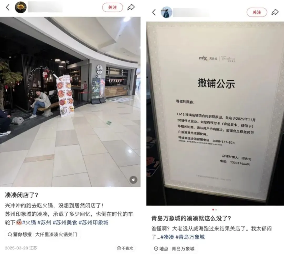 此外,记者发现,在社交平台上,有不少用户也发布了湊湊关店的相关信息。除了郑州,2025年以来,厦门、苏州、青岛等地的部分门店也陆续关闭。