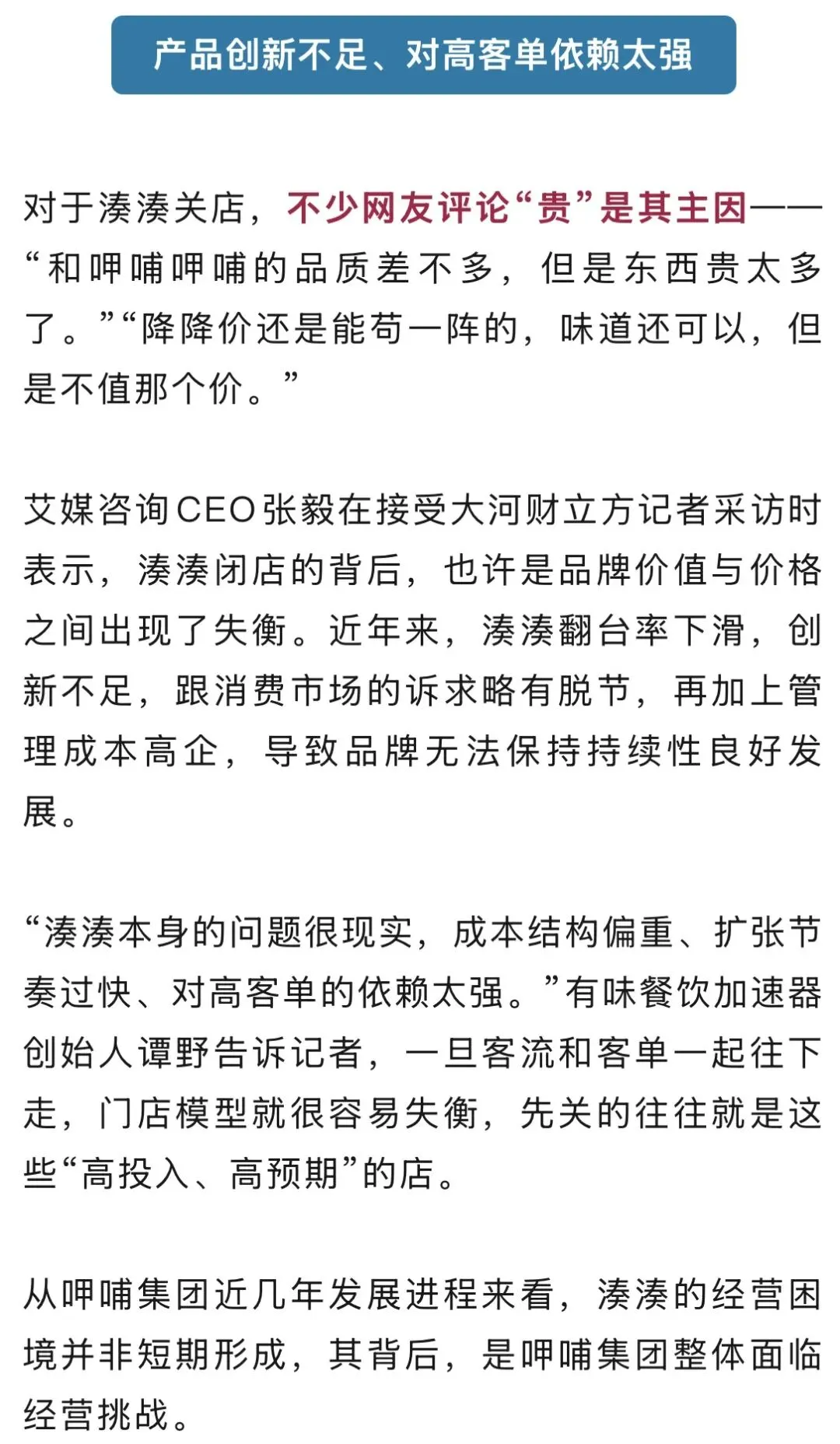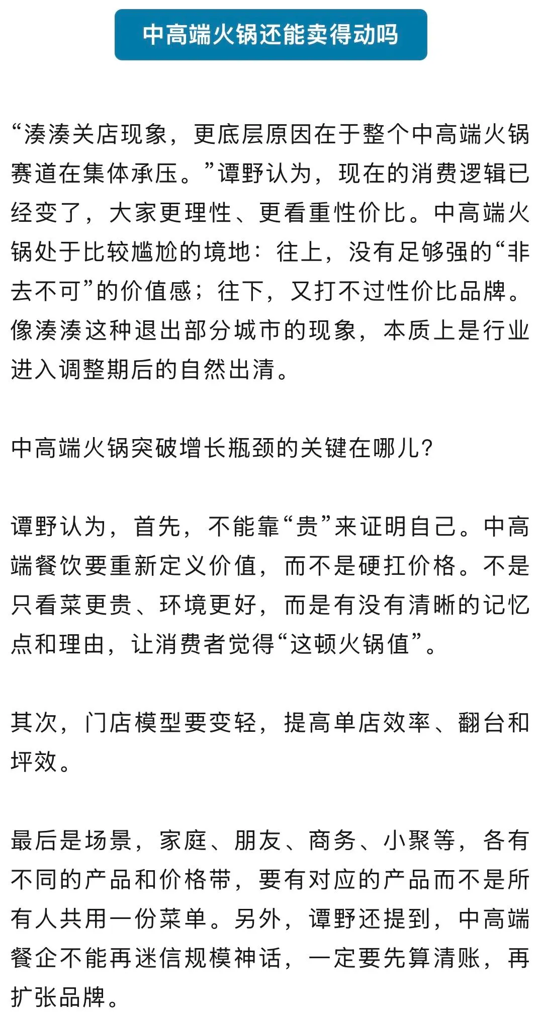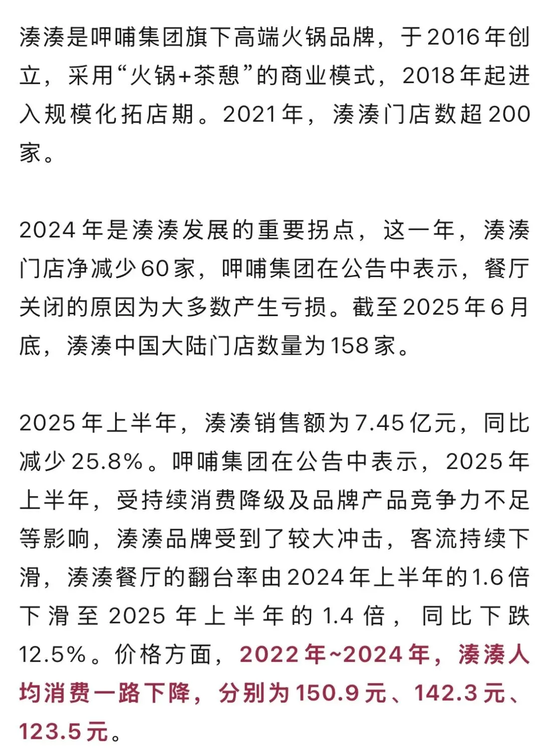 行业人士认为,除了湊湊自身发展原因,更底层原因是整个中高端火锅赛道集体承压。“现在的消费逻辑已经变了,大家更理性、更看重性价比,导致中高端火锅陷入尴尬境地:往上,没有足够强的‘非去不可’的价值感;往下,又打不过性价比品牌。”