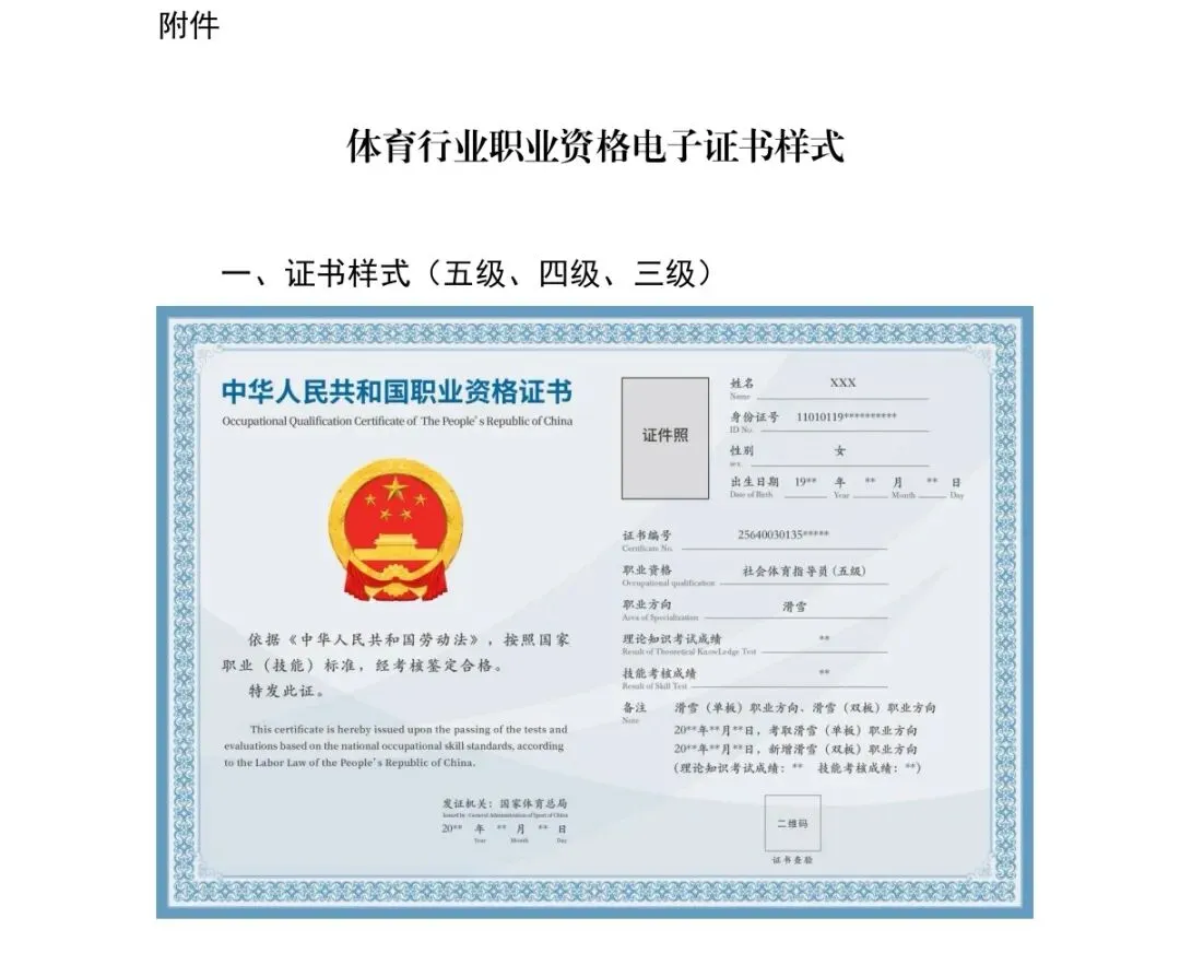 证书由人力资源和社会保障部统一印制,国家体育总局颁发。是从事社会体育指导工作必备的专业技能证明和从业任职资格的凭证,该证书纳入国家统一的证书体系。