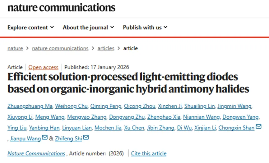 有机-无机杂化锑卤化物是溶液法制备发光二极管的新兴发光材料。然而,由于发光体内部存在非辐射复合,且器件内电荷传输性能较差,实现高效电致发光仍面临挑战。