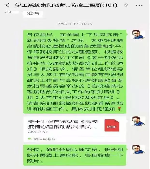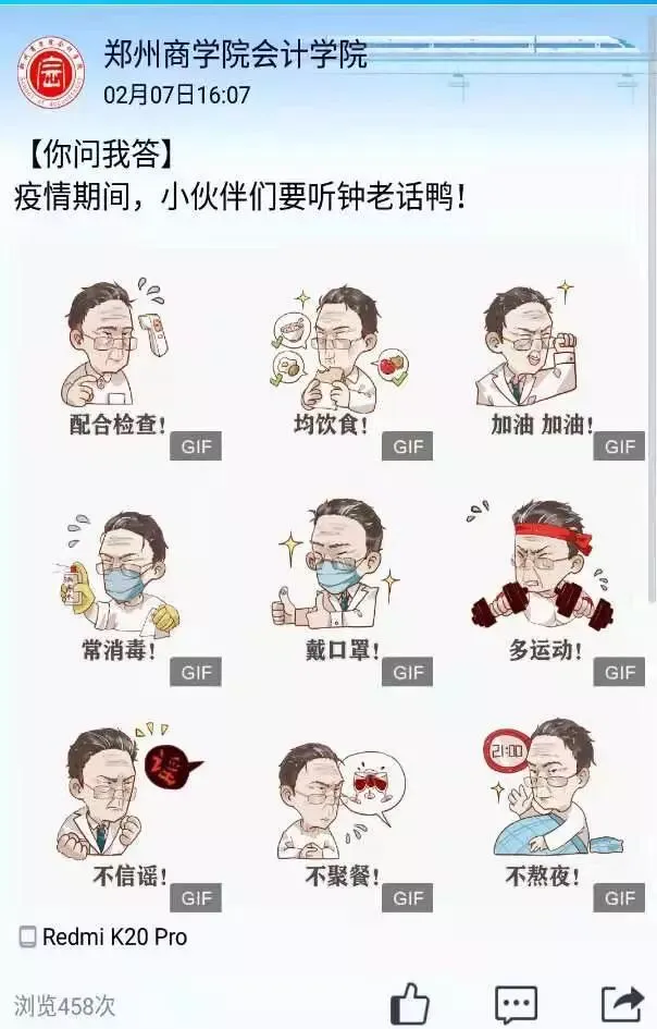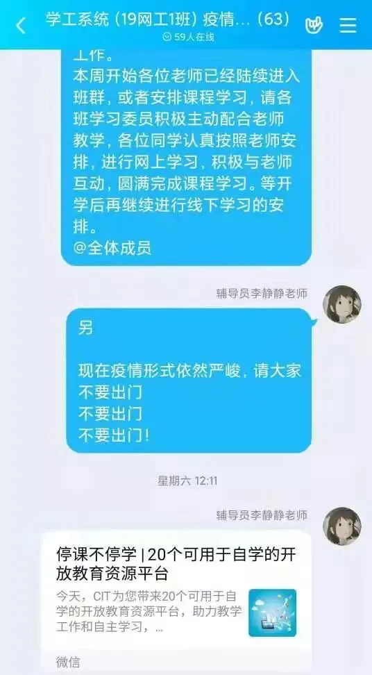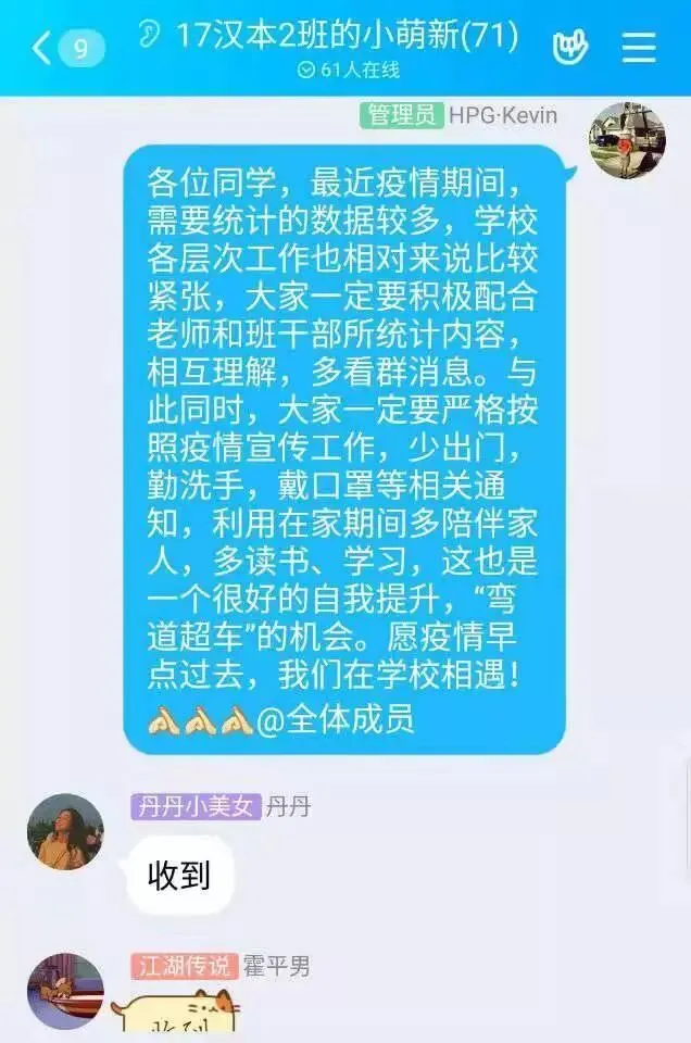 为了引导学生不信谣、不传谣,理性科学看待疫情,辅导员们通过QQ、微信公众号等新媒体渠道,推出各种抗击疫情通知、防疫常识、必备宅家技能等通知,引导同学们争做先锋,做好防范,落实各项防疫措施。