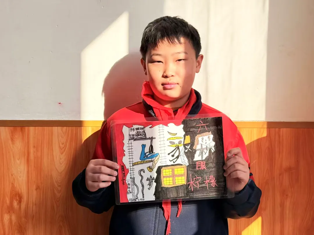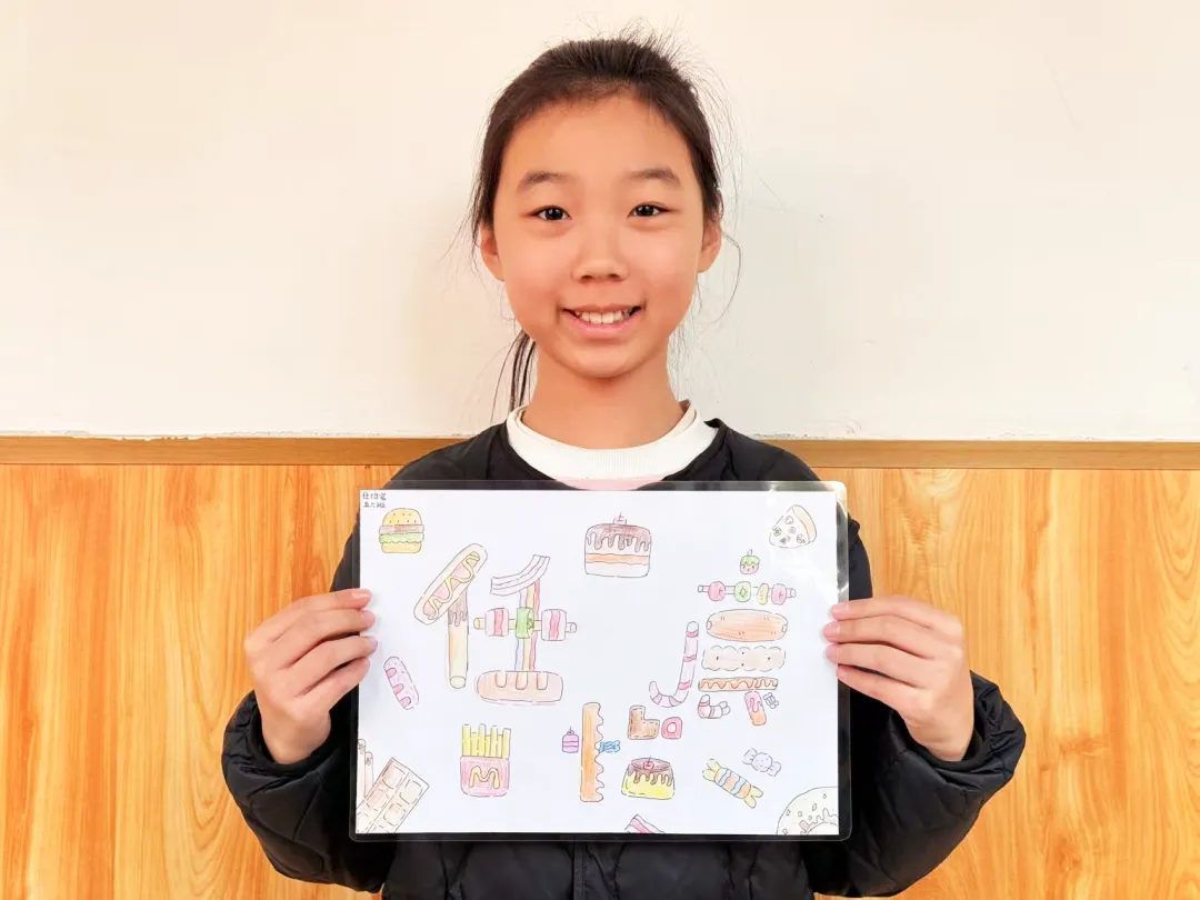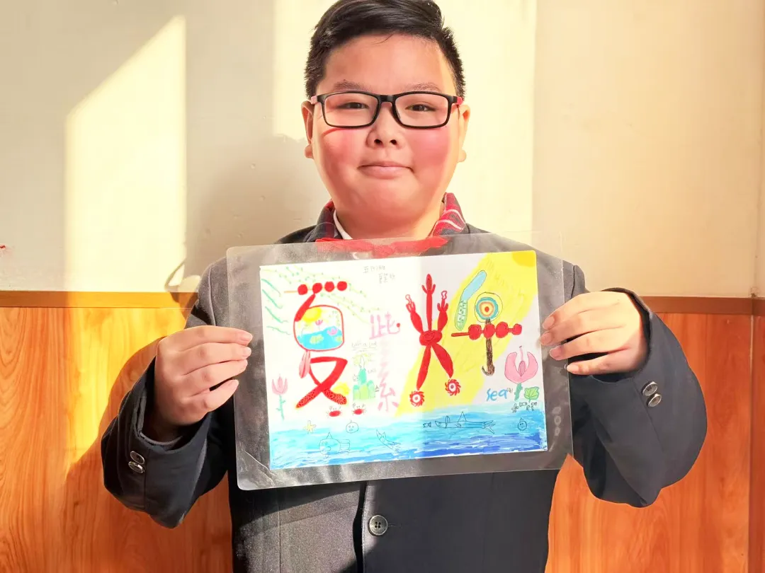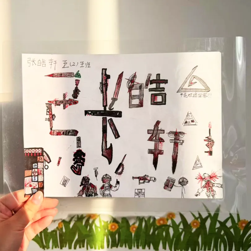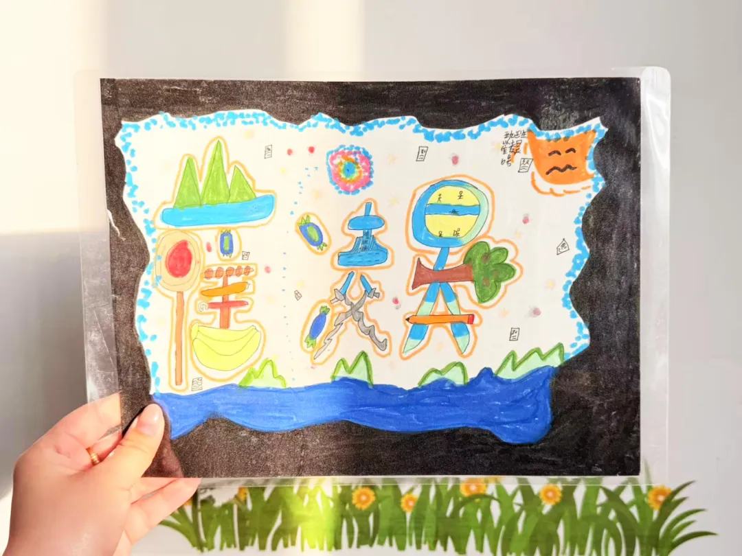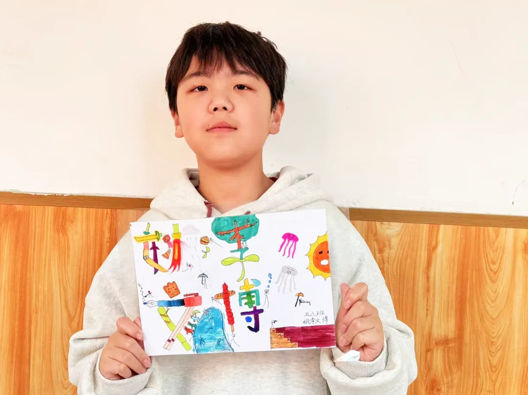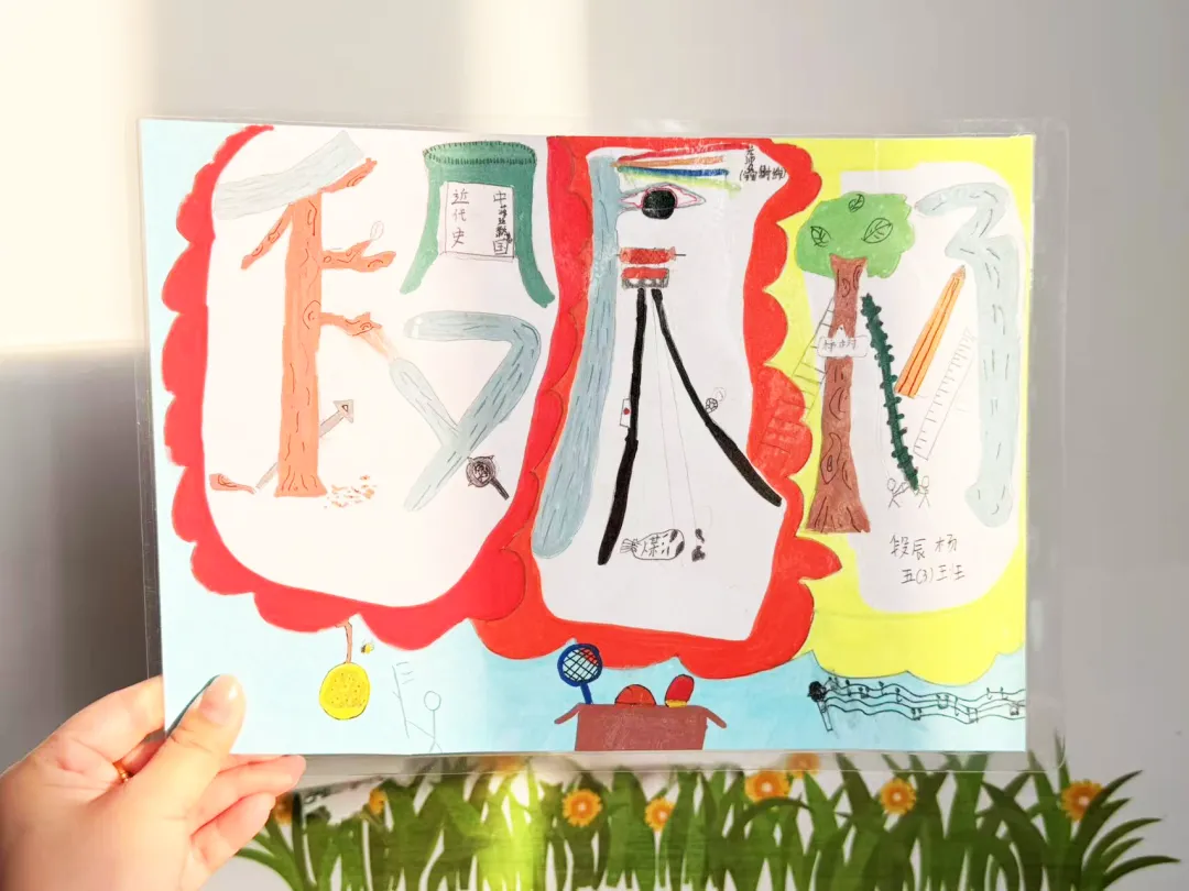 有的孩子把自己的名字变成了一场美食盛宴:“杨”字的木字旁是一根香脆的鸡腿,右边的“昜”里藏着一颗红通通的苹果;有的孩子把热爱的篮球、滑板画进了笔画里,每一条线条都透着运动的活力;还有的孩子用星星、云朵和小怪兽搭建起名字的框架,把自己天马行空的内心世界摊开在画纸上。