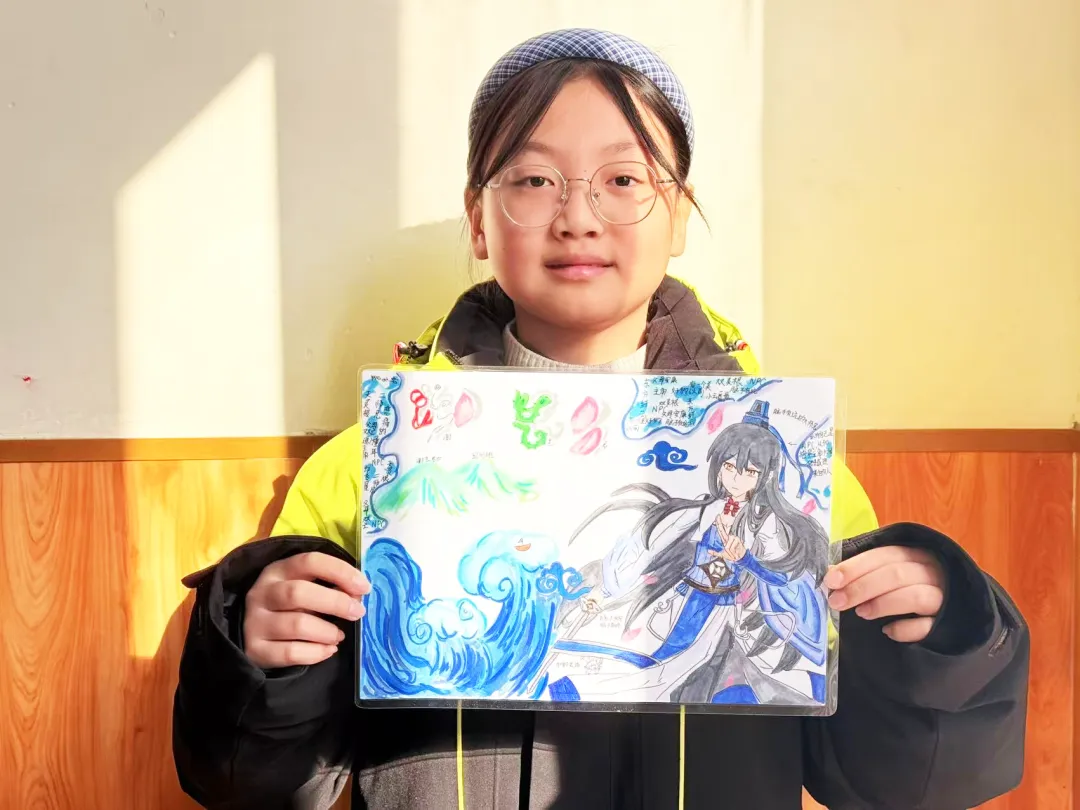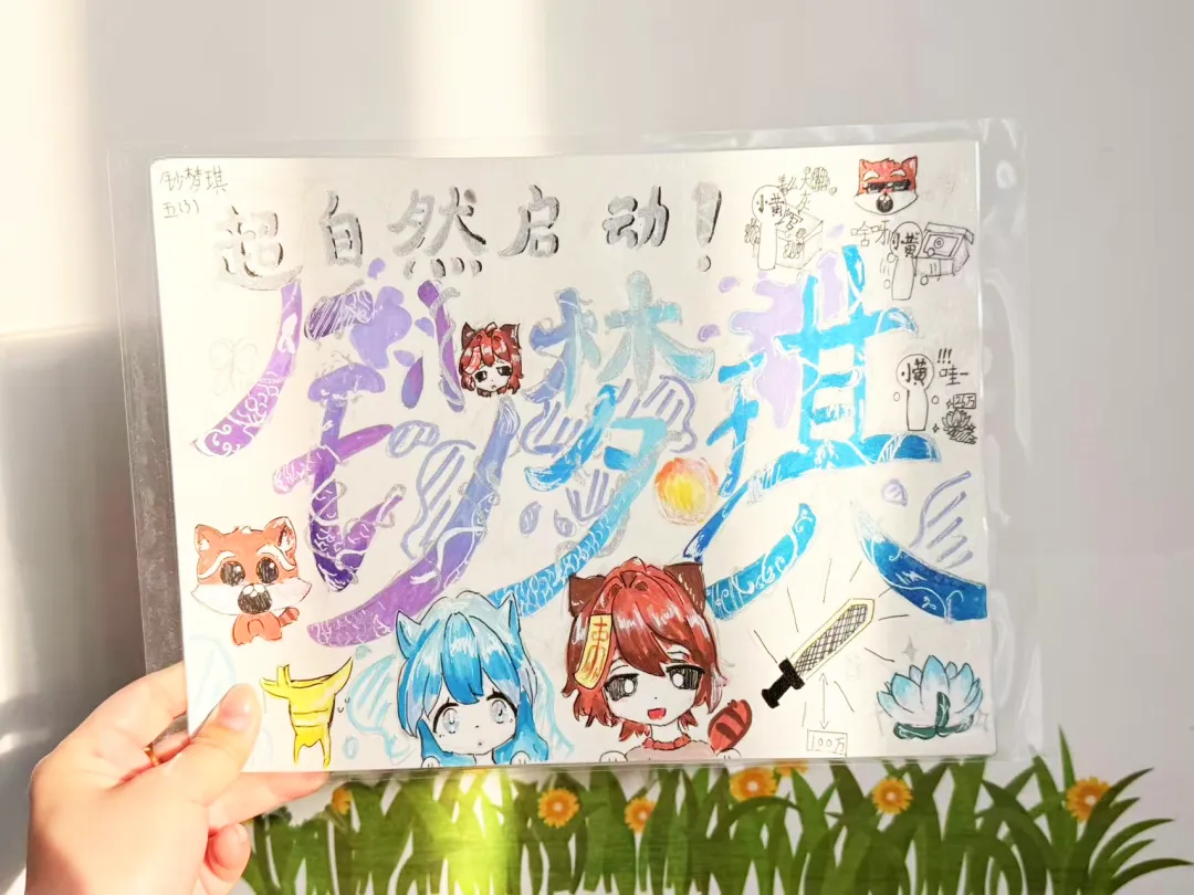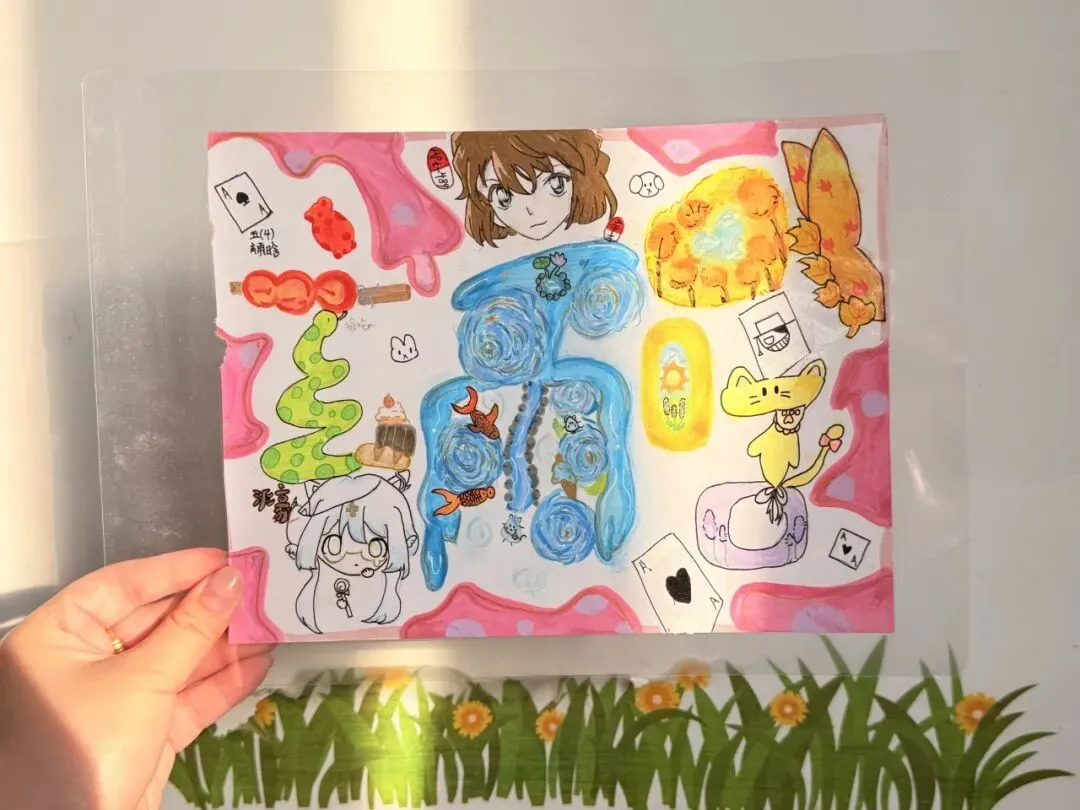 还有一名同学以动漫元素和艺术涂鸦结合的形式设计名字,梦幻色彩搭配卡通形象,让名字在创意涂鸦里鲜活起来,尽显想象力。