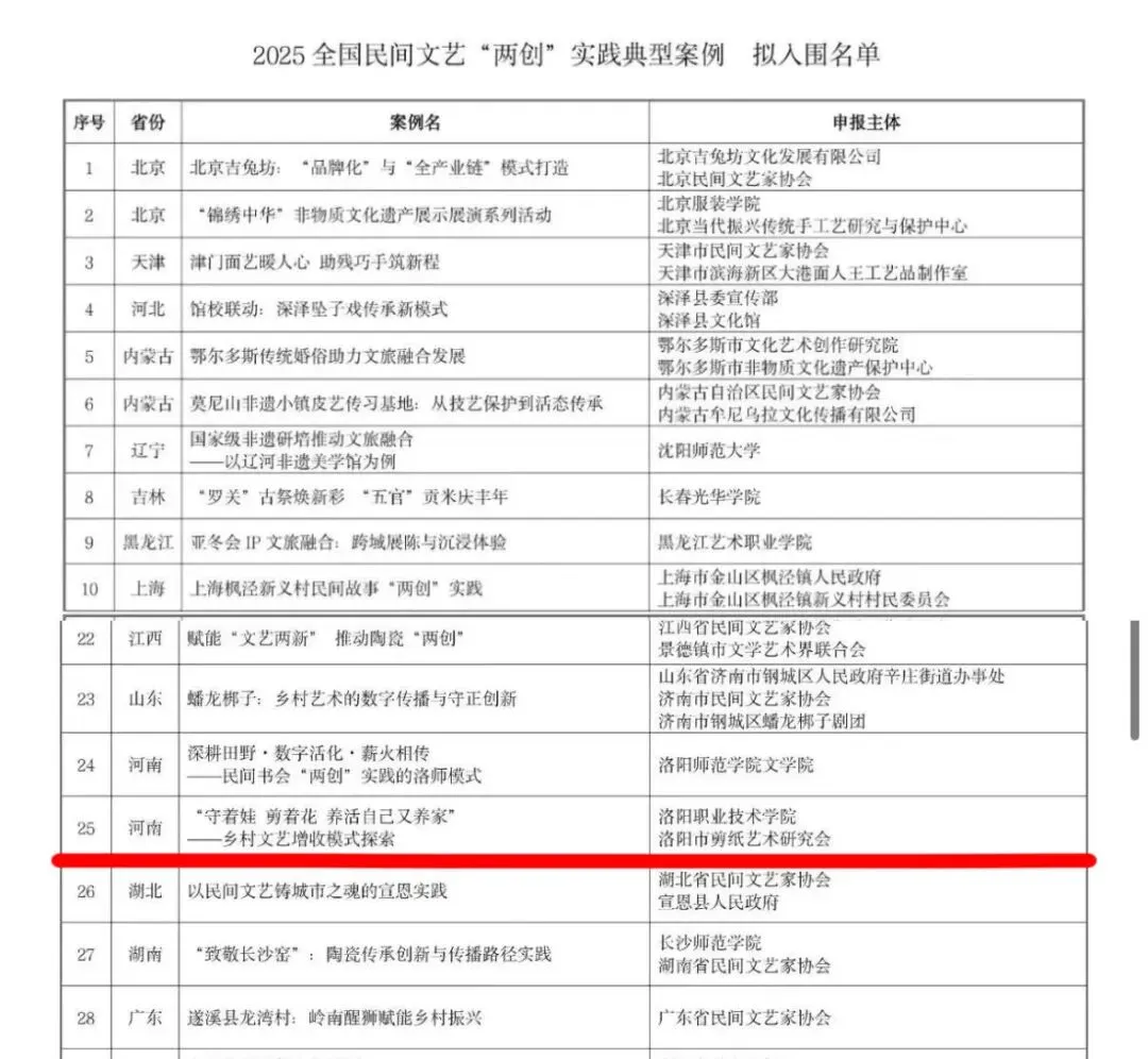 由洛阳市剪纸艺术研究会和洛阳职业技术学院联合申报的《“守着娃 剪着花 养活自己有养家”——乡村文艺增收模式探索》成功入选。