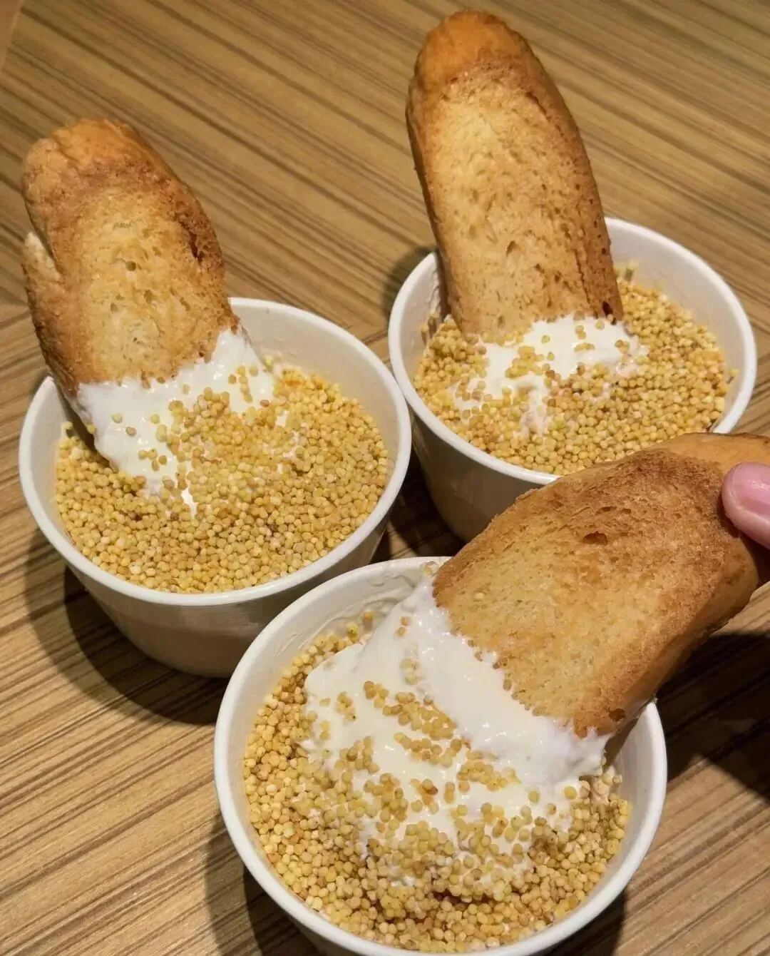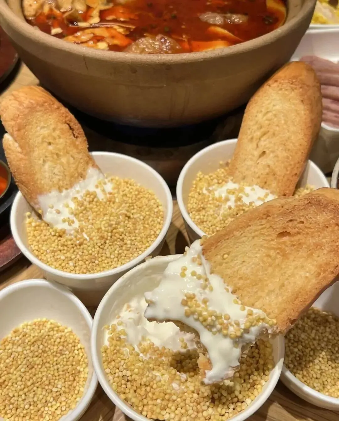 再配上那个烤面包 , 外面酥酥脆脆的 , 里面又软又有嚼劲 , 蘸着奶嚼口吃 , 满嘴都是奶香 , 这个搭配真的太妙了。