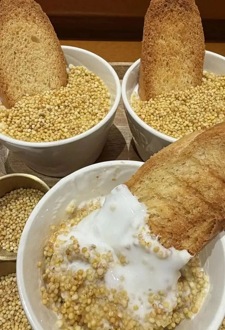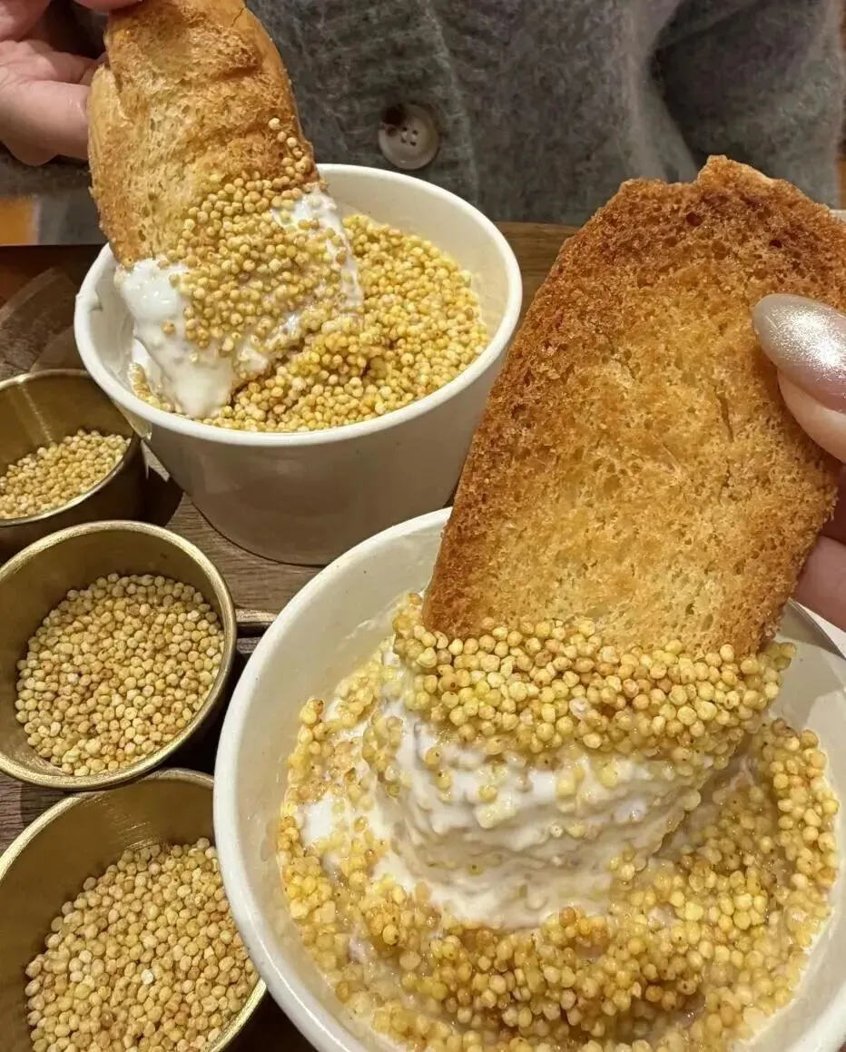 说实话 , 我当时真不知道这玩意叫啥 , 就看着挺特别的 , 白白糯糯的一团 , 旁边还配着炒米和烤面包。