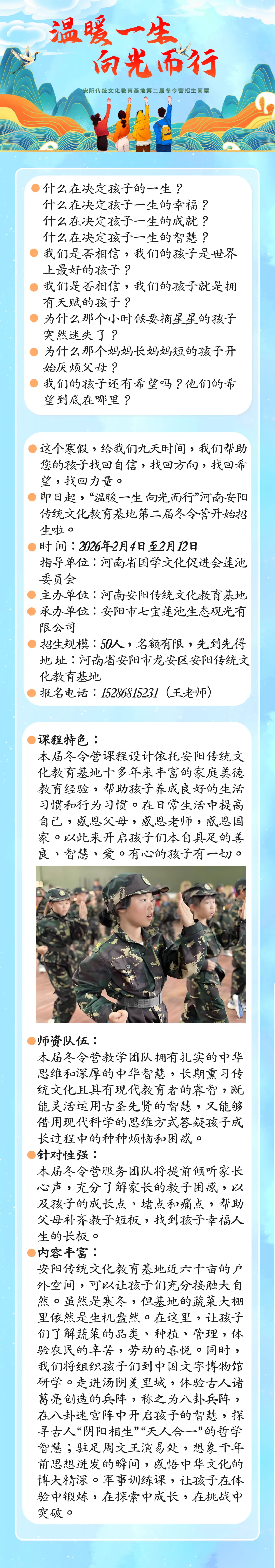 请家长给孩子自备换洗衣物、洗漱用品、水杯、拖鞋、运动鞋等生活用品。衣着庄重得体,不得散发任何广告及其他宣传资料。因学习名额有限,也因学习效果所需,本期冬令营只接收9天全程参加的孩子。孩子的父母或一方必须参加学习班第一天和最后一天的现场课程。此外每天可按时收看群内视频,并完成老师布置的作业,与孩子共同学习成长。