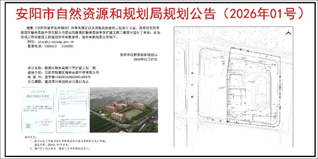 城市建设中,教育配套建设很重要,关系着一个区域乃至城市优质教育的均衡发展。安阳1月份都有哪些新规划?哪些又和您息息相关?以下项目为殷都区翰林高级中学扩建工程二期,该项目位于安阳市殷都区华祥路与华胜街交叉口东南,建设规模为29151.91平方米,建设单位为安阳市殷都区翰林高级中学有限公司。规划1#综合教学楼5层,2#教学楼5层,3#教学楼5层,5#食堂2层,6#宿舍5层,8#宿舍5层,以及运动场地和集中绿地。