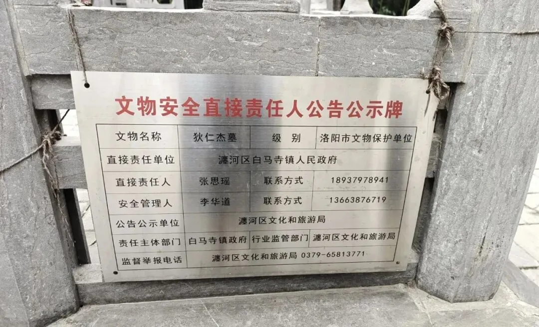 狄仁杰墓位于在寺院门东南200多米处,在通往齐云塔的路南方向。爱人给孩子讲:“我们看到的这个墓,是一位大唐明相的墓地。记得我小时候常听镇上的老人们说讲—这里有个狄仁杰墓,为了纪念他,在这建了祠堂和石碑,这是一段真实的历史。”近年文旅部门正式挂牌,确认为洛阳文物保护单位。