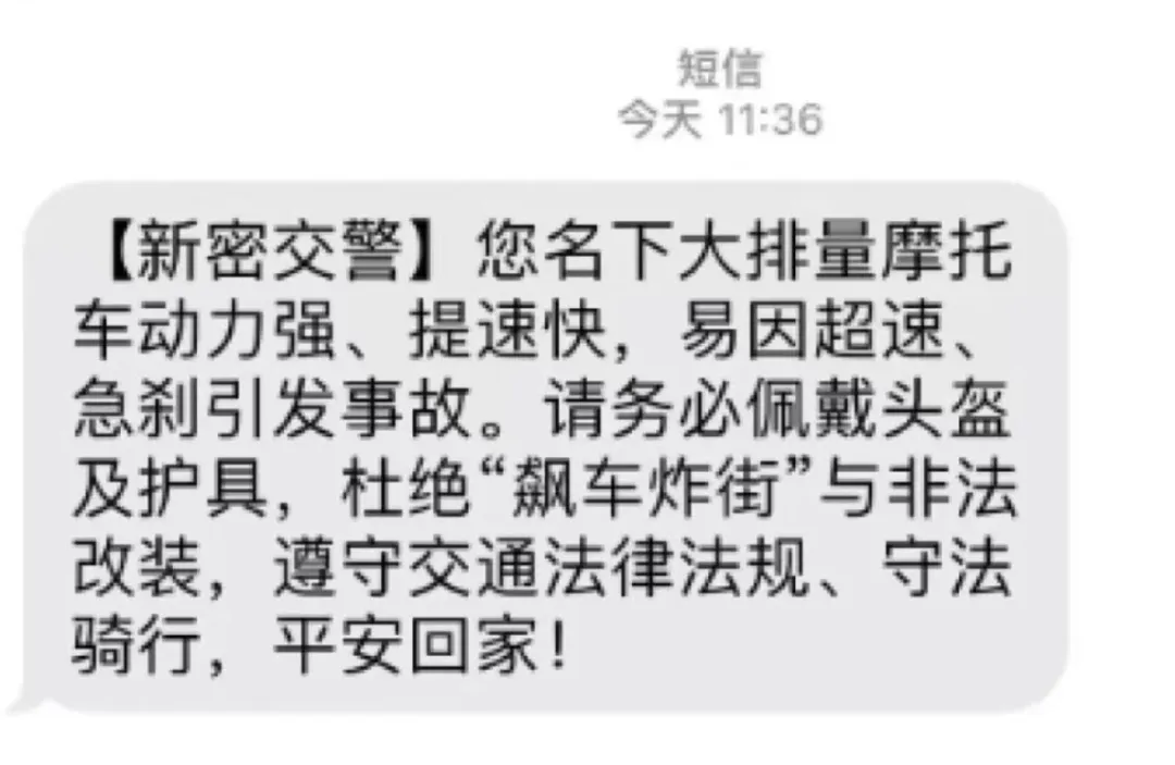新密交警发送的短信精准聚焦大排量摩托车,明确提示:“您名下大排量摩托车动力强、提速快,易因超速急刹引发事故。请务必佩戴头盔及护具,杜绝‘飙车炸街’与非法改装……”