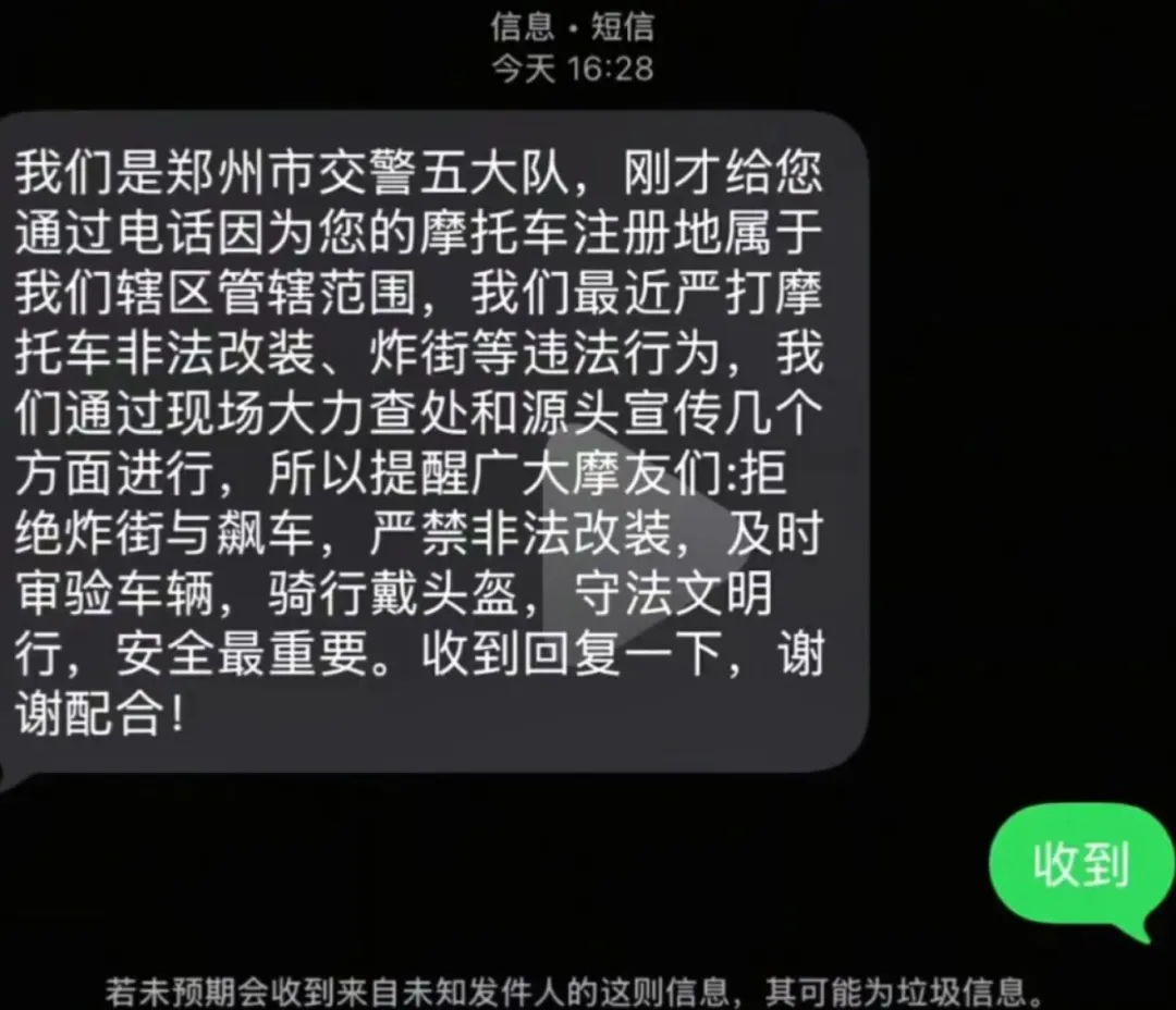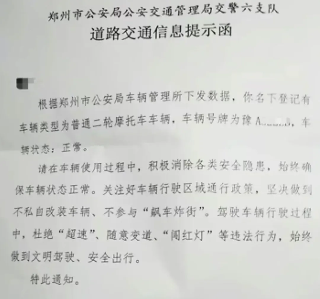 郑州交警六大队则通过道路交通信息提示函告知车主:“你名下登记有普通二轮摩托车,请在使用过程中积极消除安全隐患,确保车辆状态正常,关注通行政策,坚决不私自改装、不参与‘飙车炸街’……”