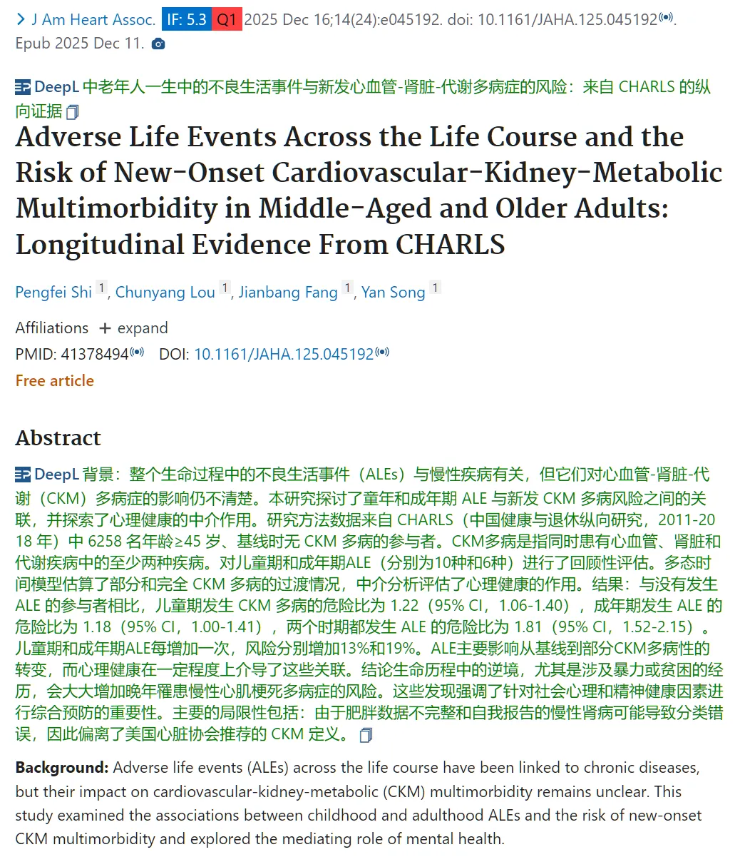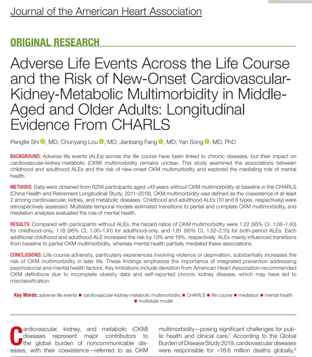 研究发现ALE主要影响从基线到部分CKM多病的转变,心理健康在这一过程中的作用被部分介导。
