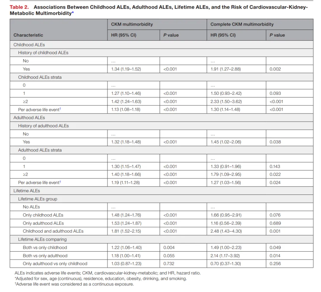 例如,儿童期ALE的风险比为1.22,表示与没有ALE的参与者相比,经历ALE的参与者罹患CKM多病的风险增加了22%。