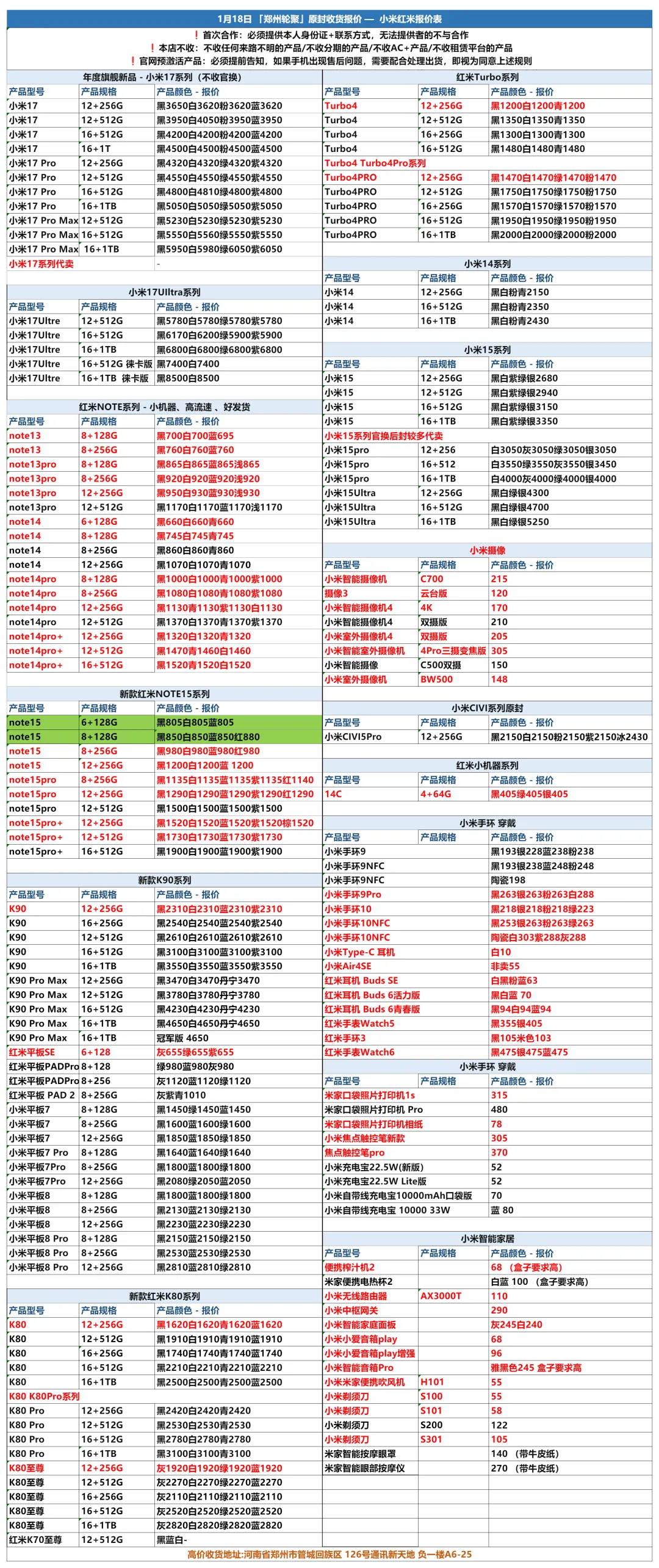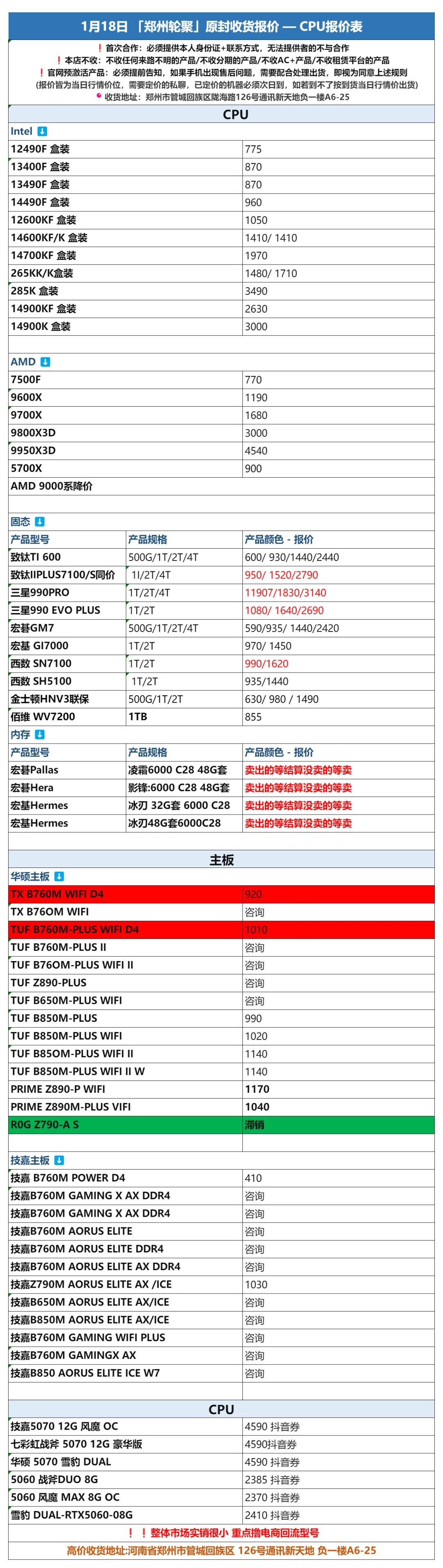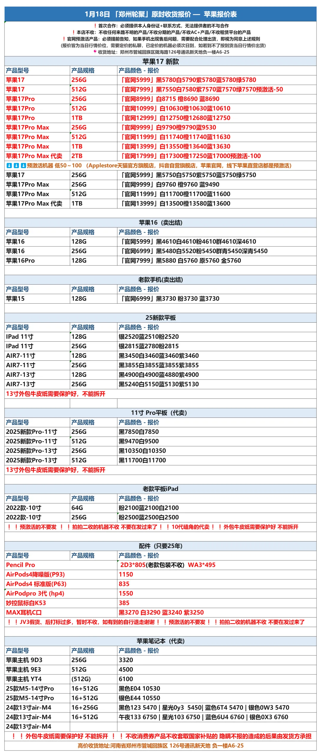>郑州轮聚通讯 2026年1.18日数码报价更新