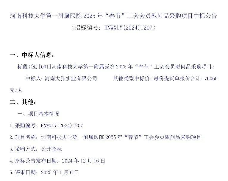 洛阳妇幼保健院与河科大一附院,发布员工春节福利中标公告