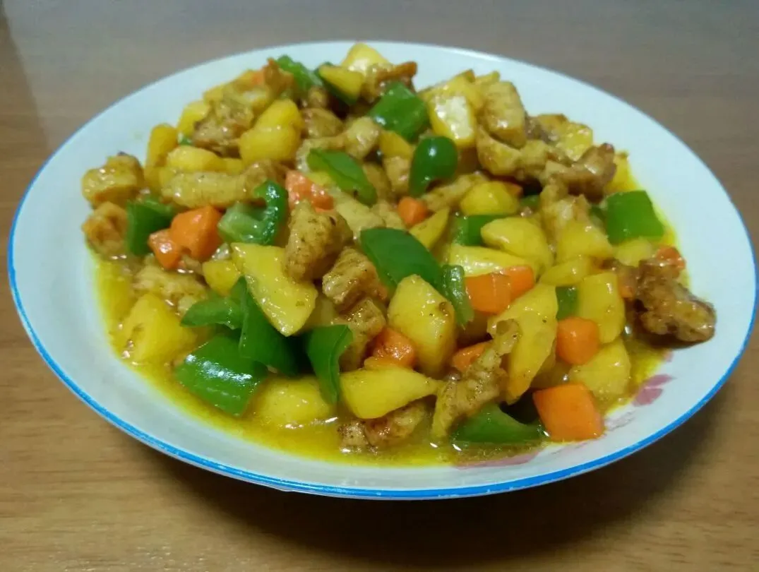 咖喱鸡块、杏鲍菇炒肉、花菜炒肉、卤海带丝、爆炒青甘蓝、炸酱面、番茄鸡蛋面、炒面、香酥鸡米花、麦多馅饼、香酥豆沙饼、烤肉饼、葱油饼、紫菜蛋花汤。