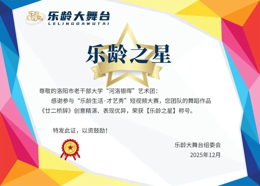 四、荣誉:初心开花,这才是岁月最美的模样 “乐龄之星”的证书,是对这群银发舞者的最好礼赞。拿到荣誉时,学员们在学习群里分享喜悦表情包——这份认可,不仅是对作品的肯定,更是对“银发青春”最动人的致敬。 她们用行动诠释着:热爱无关年龄,深情不惧时光;只要心中有诗,脚下就有舞台;只要眼里有光,生活就永远芬芳。 “美可以如此从容,岁月可以如此优雅。” 是啊,她们不是在追忆青春,而是在诠释超越年龄的美——与岁月和解,与时光共舞,与深情同在。