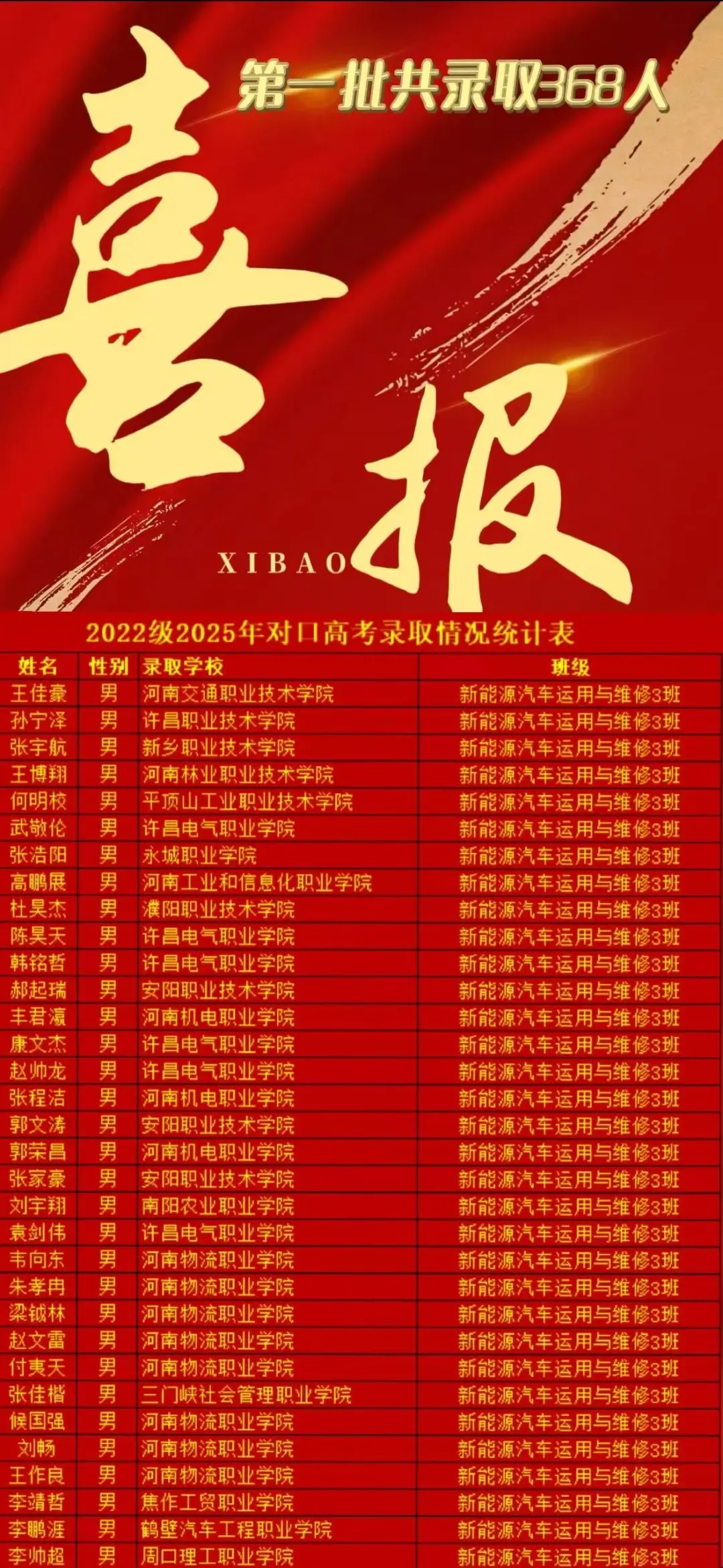 截至目前,我校升学部毕业生被天津大学录取69名,开封大学录取76名,洛阳理工学院录取112名,焦作大学录取336名,郑州大学录取62名,河南大学录取59名......