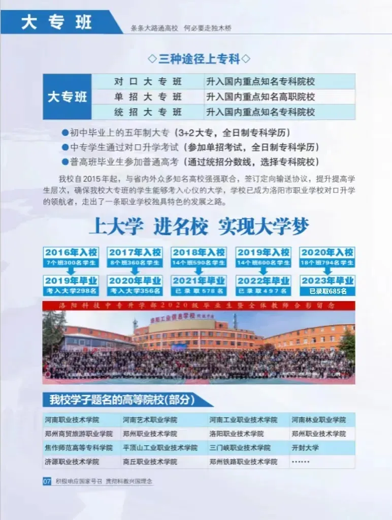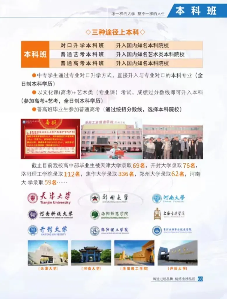 一切让成绩说话,质量才是硬道理,近几年高考,我校被中国传媒大学、上海音乐学校、天津大学、郑州大学、西安交通大学、开封大学等名牌大学录取的学生人数逐年上升,本科上线率历年提高,升学喜讯使一批批原本升学无望的职业学校学生重新找回了自信,实现了大学梦想,学校已成为洛阳职教高考的先锋军。