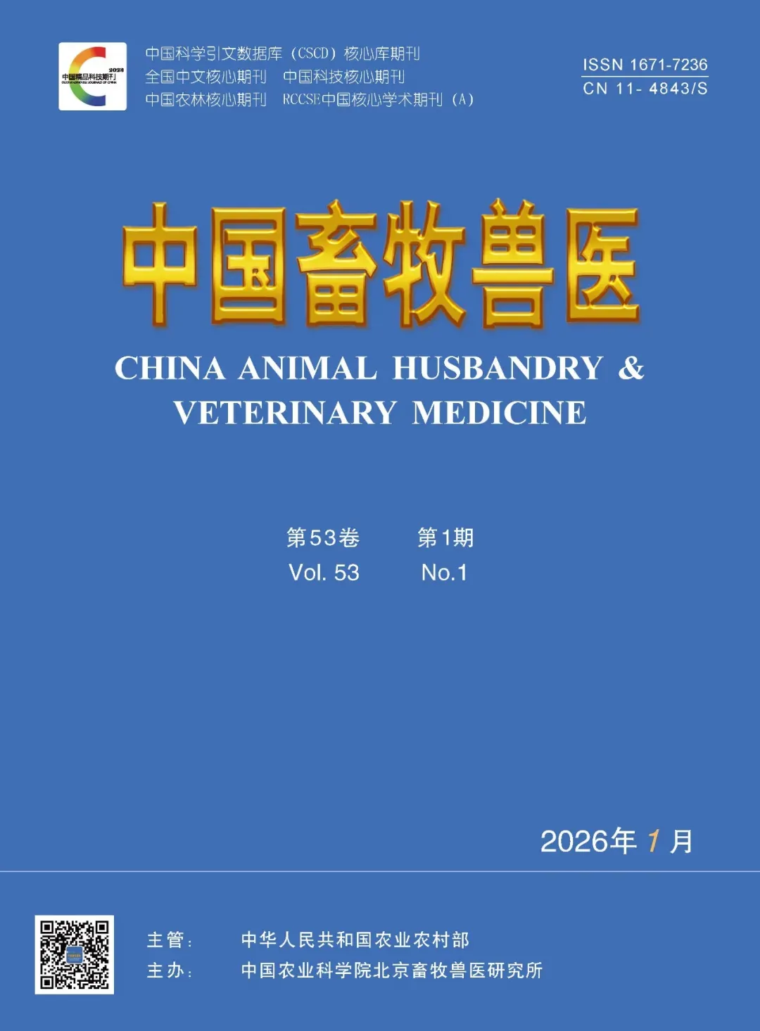 《中国畜牧兽医》1974年2月创刊,月刊,入选《科技期刊世界影响力指数(WJCI)报告(2024版)》,在入选的中文期刊“动物医学(兽医学)”领域排名第1位;同时是“中国科学引文数据库(CSCD)”、“中国精品科技期刊”、“中国科技核心期刊”、北大《中文核心期刊要目总览》、“中国农林核心期刊”和“RCCSE中国核心学术期刊(A)”收录期刊。本刊设有营养与饲料、生理生化、生物技术、遗传繁育、基础兽医、预防兽医、临床兽医、质量安全、环境安全等栏目。