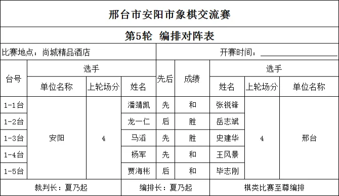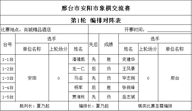 两地参赛阵容为:安阳市代表队由贾海彬、杨军、潘靖凯、龙一仁、马滔5位棋手组成,邢台市代表队则首发派出史建华、毕志刚、王风景、岳志斌、张锐锋5位选手,双方阵容厚实,不可谓不强劲。