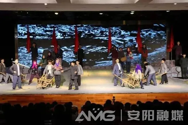 “劈开太行山,漳河穿山来,林县人民多壮志,誓把山河重安排……”在林州市世纪学校,200多名小学生演绎的少年版话剧《红旗渠》,再现了林县人民在党领导下“重新安排林县河山”的壮举。