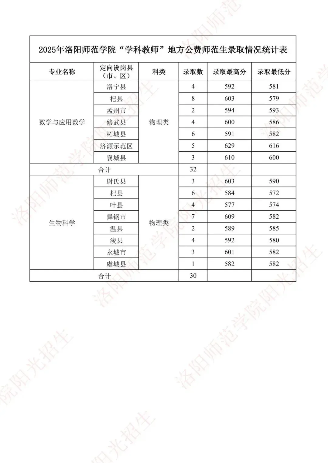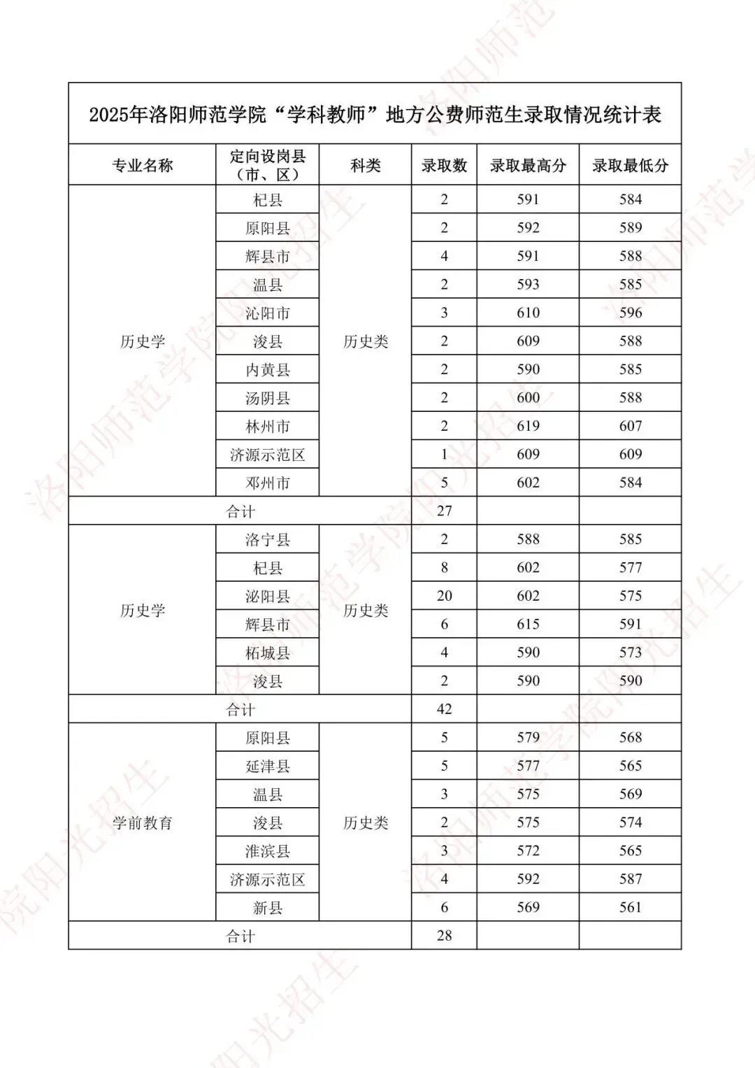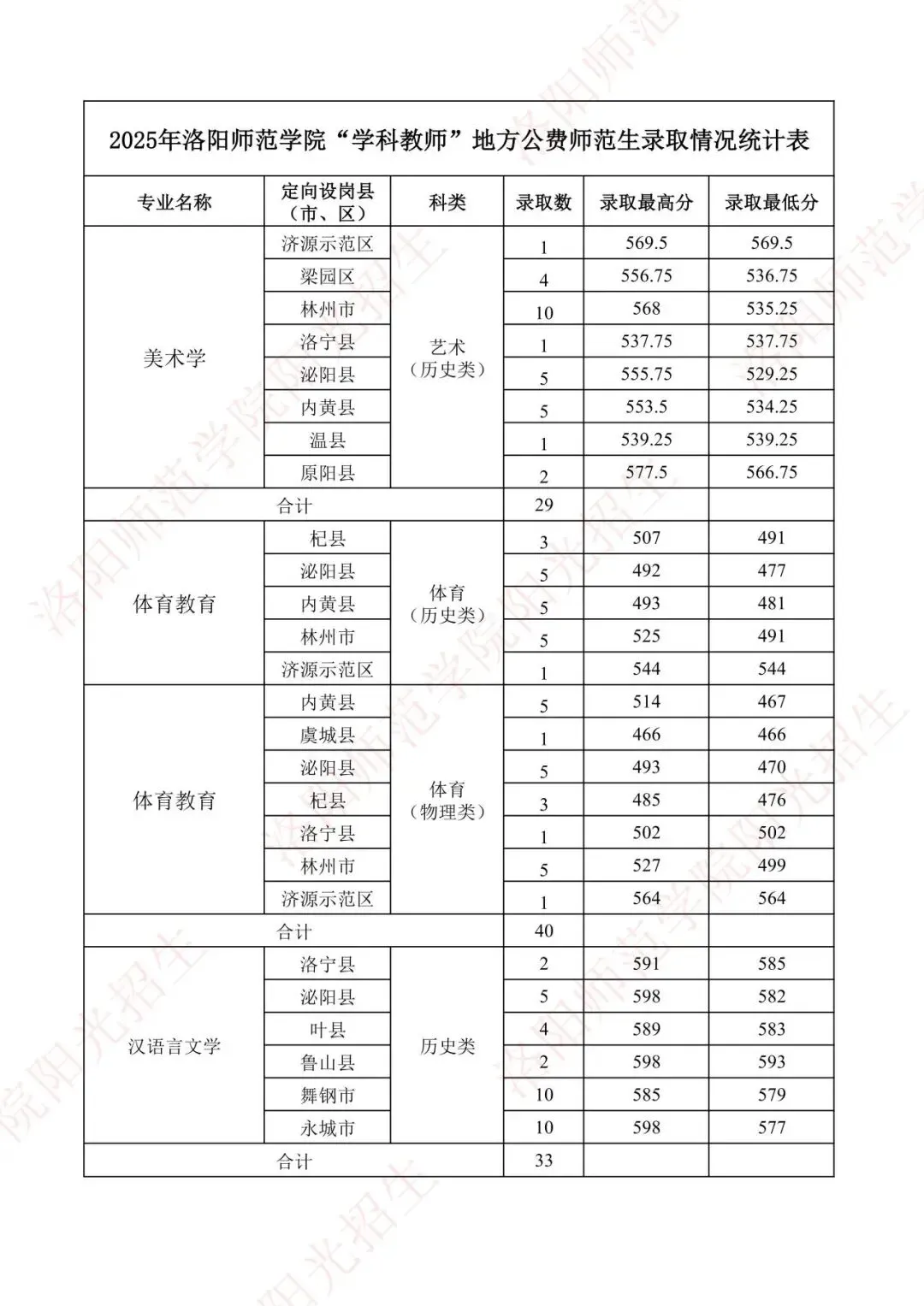 2025年洛阳师范学院“学科教师”地方公费师范生录取情况统计表