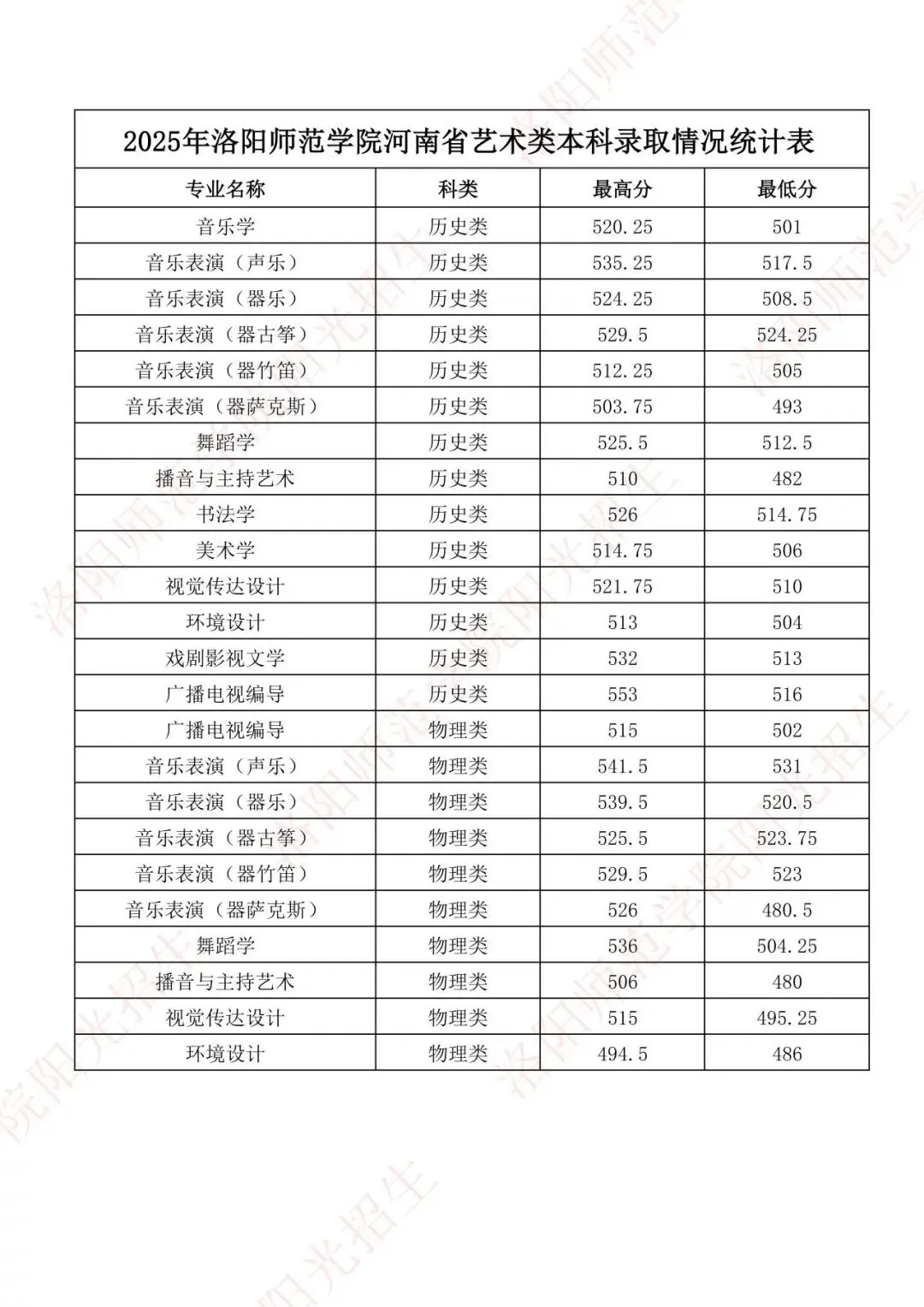 2025年洛阳师范学院河南省艺术类本科录取情况统计表