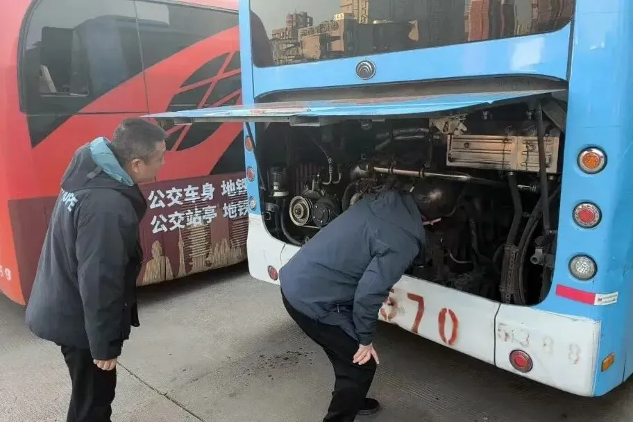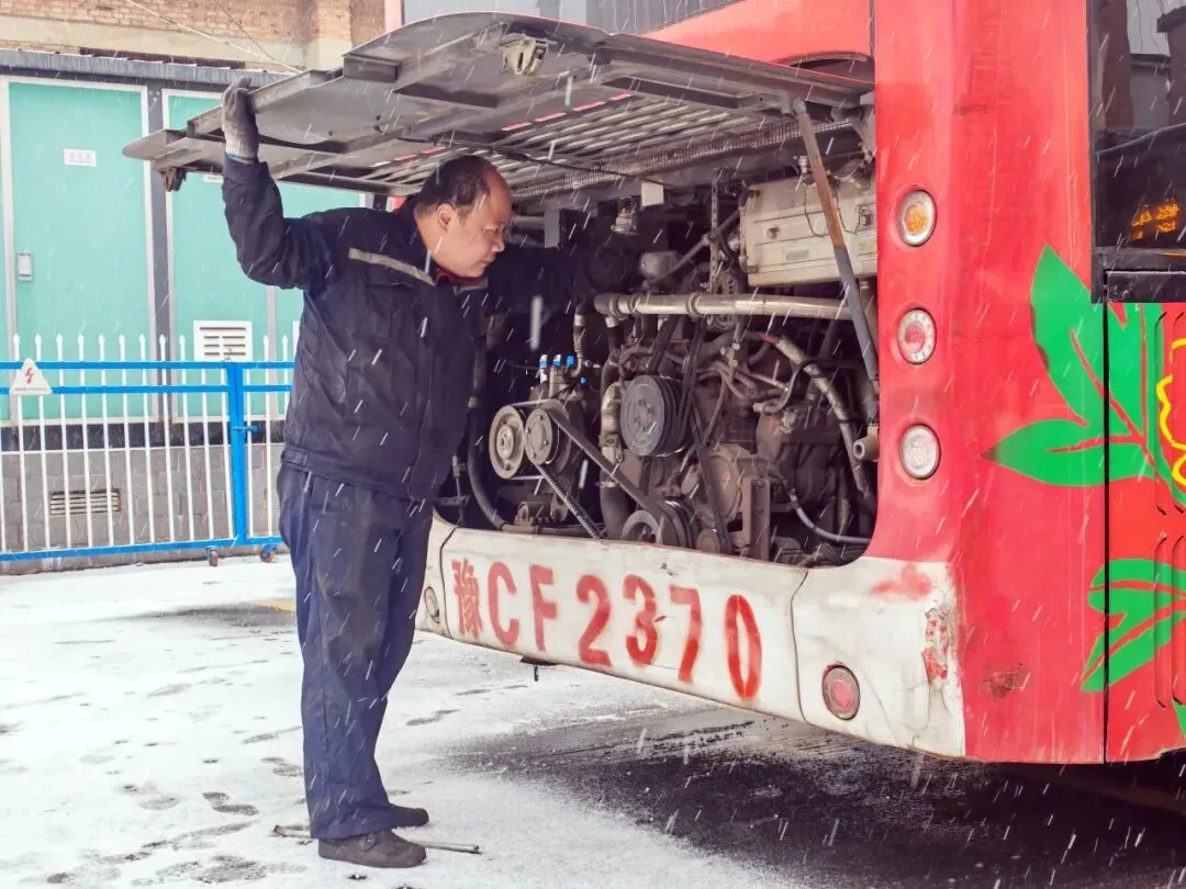 修理人员给车辆做好“暖身”检查,暖风、防冻液——每一辆公交车都要安心上岗。