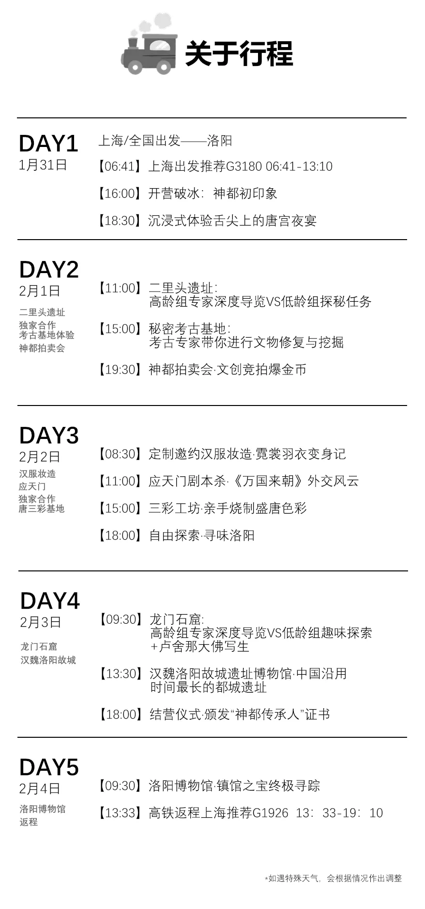 · 大交通全覆盖:独立出行的儿童,上海-洛阳往返高铁票亦包含在内,行程中所有门票、体验、住宿、餐饮、师资、摄影及物料费用均已涵盖。(亲子出发则需自行定票噢)