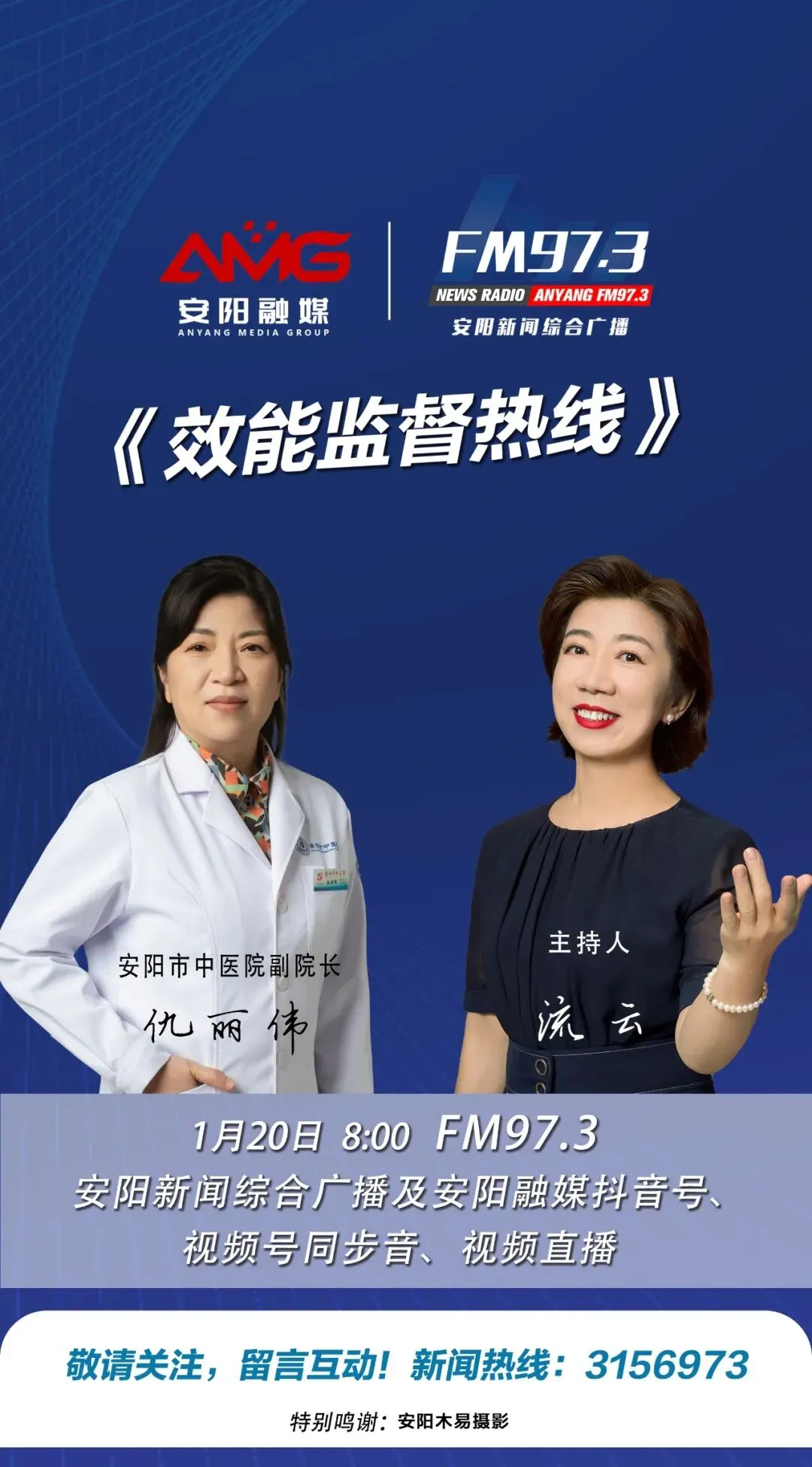 1月20日8:00,安阳市中医院副院长仇丽伟做客新闻综合广播《效能监督热线》。节目将通过FM97.3安阳新闻综合广播及安阳融媒抖音号、视频号同步音、视频直播。敬请关注,留言互动!