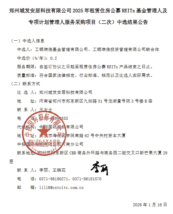 >郑州城发安居科技有限公司租赁住房公募REITs基金管理人服务采购项目(二次)中选结果