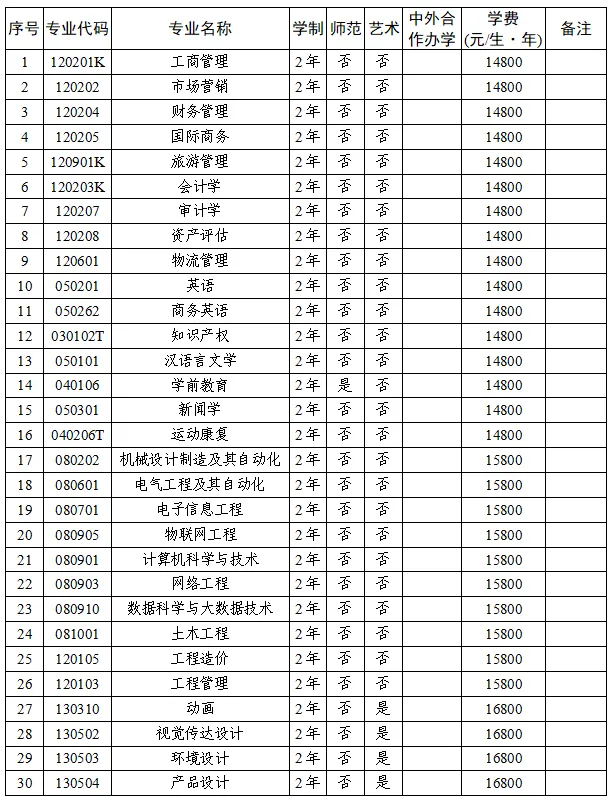 (一)学费:机械设计制造及其自动化、电气工程及其自动化、电子信息工程、物联网工程、计算机科学与技术、网络工程、数据科学与大数据技术、土木工程、工程造价、工程管理专业学费为15800元/生·年;动画、视觉传达设计、环境设计、产品设计专业学费为16800元/生·年;其余专业学费均为14800元/生·年。