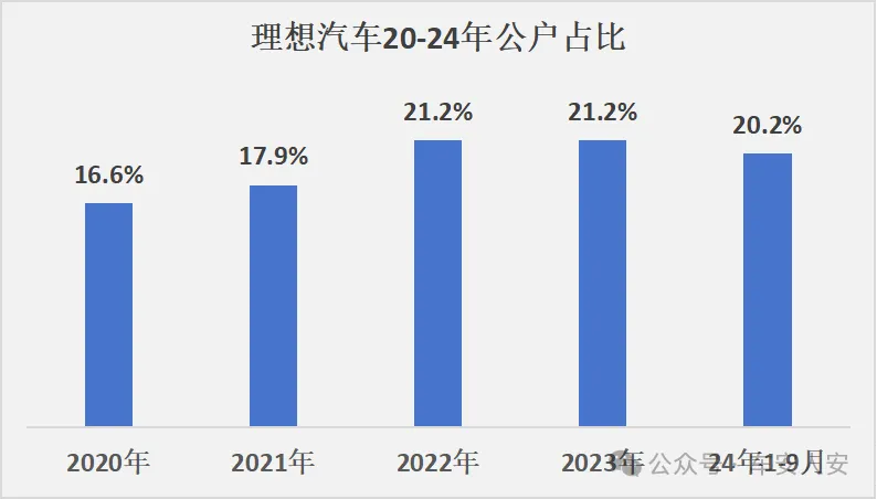 如上图所示,总量上理想20-24年公户占比没有大的变化,都在20%左右。