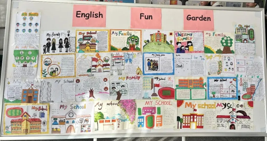 七年级同学以学校和家人为主题。在“家人”主题的作品里,我们看到了各种充满爱意的表达:有的同学用可爱的卡通画风,画出了和爸爸妈妈、兄弟姐妹的温馨瞬间;有的同学画出了自己的“家庭树”,让大家在认识彼此家庭的同时,也锻炼了英文表达。 而“学校”主题的作品,则像一个个微型校园图鉴。红墙绿树的教学楼、宽阔的操场、迎风飘扬的国旗,每一笔色彩、每一段文字,都藏着同学们对校园生活的热爱与归属感。当“家人”的温暖与“学校”的活力在展板上相遇,我们看到的不只是一幅幅作品,更是孩子们眼中最真切的生活。