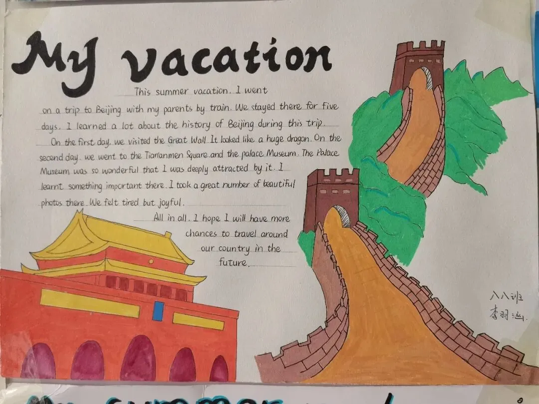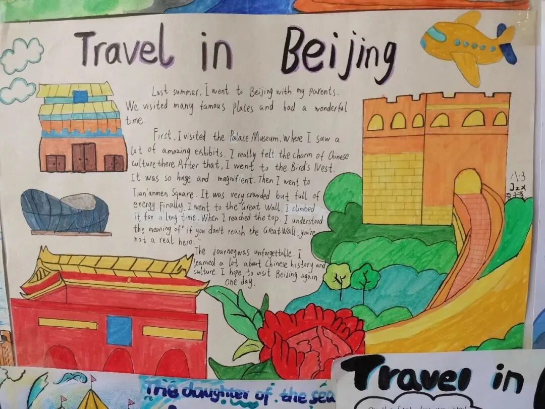 八年级同学以旅行为主题。从北京故宫的红墙黄瓦,到大理洱海的澄澈蓝天;从苏州园林的亭台水榭,到三亚海滩的椰林树影,大胆的配色与丰富的装饰,让“旅行”这个主题变得立体又鲜活。有的同学用卡通画风记录了在济南趵突泉的邂逅,有的则用写实笔触还原了在北京天安门的庄严瞬间。每一幅作品都是一段独家记忆的生动呈现。 每一份手抄报里,都藏着一段鲜活的旅行故事。