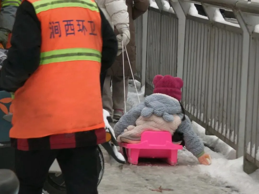 这两天的上学路,不少家长都拿出这样的雪橇车,拖着小朋友上学,拖着小朋友放学。