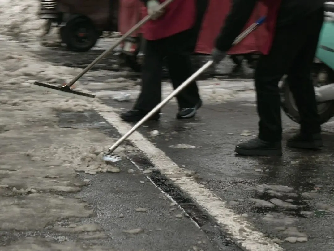 最先到岗的上班人士都被安排了最新任务:一起扫雪。街上的各家店铺连同保安、保洁、环卫工人一起敲敲打打,叮叮当当。大家先把各家门口的积雪和冰冻层清理完毕,又依次回到门前的非机动车道上。机动车道上的积雪就交给了撒盐车。