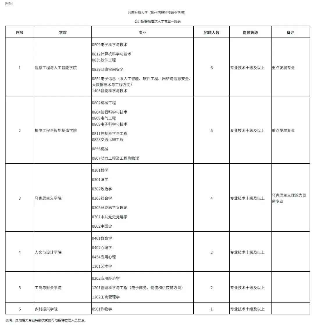 1.河南开放大学(郑州信息科技职业学院)公开招聘高层次人才专业一览表