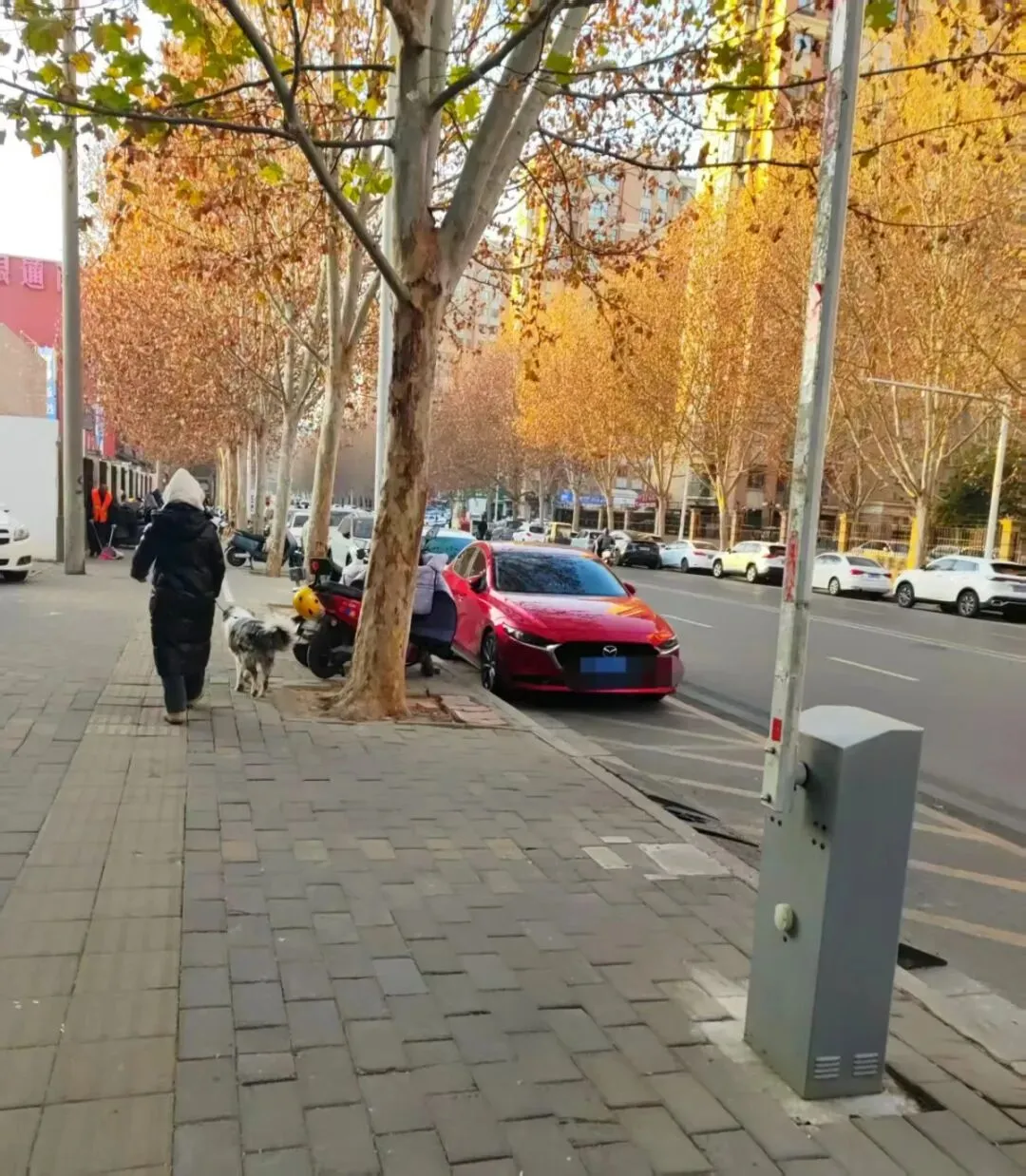 而1月17日,记者再次回访发现,该挡杆装置的杆已经不见,但下方的基座还在,路东墙边,依然还是停了很多车。
