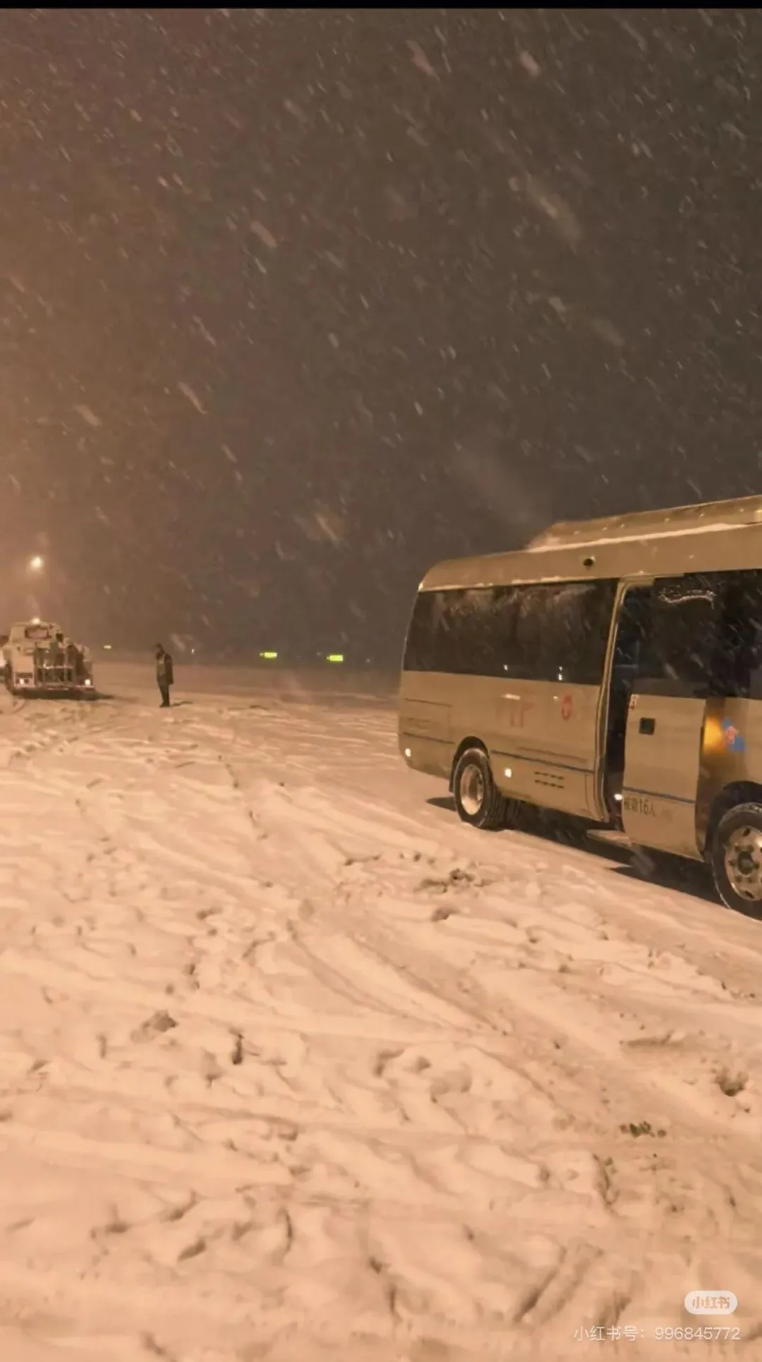 第二张,是雪夜里的车。一辆大巴车在积雪中亮着灯,车门敞开,仿佛在等待,又不知在等谁。它可能就是那位旅客文中提到的,那辆“围着机场开了两个半小时,最后说没房间”的车。