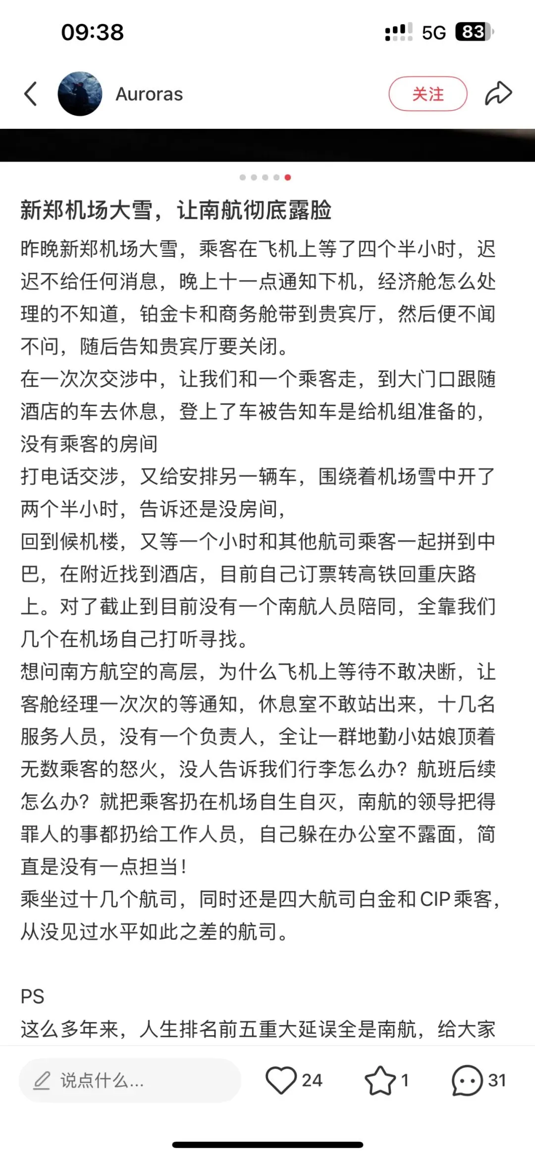而第三张,那位ID为“Auroras”的铂金卡旅客长达数百字的控诉截图,则将前两张静态的画面,串联成了一场令人窒息又荒诞的体验纪实: